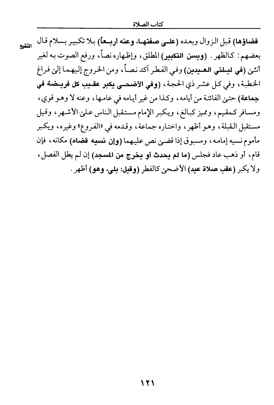 قضاؤها) قبل الزوال وبعده (على صفتها، وعنه أربعا) بلا تكبير بسلام قال بعضهم: كالظهر. (ويسن التكبير) المطلق، وإظهاره نصا، ورفع الصوت به لغير أنثى (في ليلتي العيدين) وفي الفطر آكد نصا، ومن الخروج إليهما إلى فراغ الخطبة، وفي كل عشر ذي الحجة، (وفي الأضحى يكبر عقيب كل فريضة في جماعة) حتى الفائتة من أيامه، وكذا من غير أيامه في عامها، وعنه لا وهو قوي، ومسافر كمقيم، ومميز كبالغ، ويكبر الإمام مستقبل الناس على الأشهر، وقيل مستقبل القبلة، وهو أظهر، واختاره جماعة، وقدمه في "الفروع" وغيره، ويكبر مأموم نسيه إمامه، ومسبوق إذا قضى نص عليهما (وإن نسيه قضاه) مكانه، فإن قام، أو ذهب عاد فجلس (ما لم يحدث أو يخرج من المسجد) إن لم يطل الفصل، ولا يكبر (عقب صلاة عيد) الأضحى كالفطر (وقيل: بلى، وهو) أظهر.
