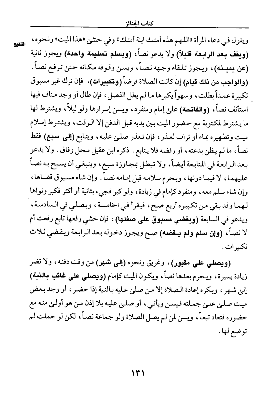 ويقول في دعاء المرأة "اللهم هذه أمتك ابنة أمتك" وفي خنثى "هذا الميت" ونحوه، (ويقف بعد الرابعة قليلا) ولا يدعو نصا، (ويسلم تسليمة واحدة) ويجوز ثانية (عن يمينه)، ويجوز تلقاء وجهه نصا، ويست وقوفه مكانه حتى ترفع نصا.