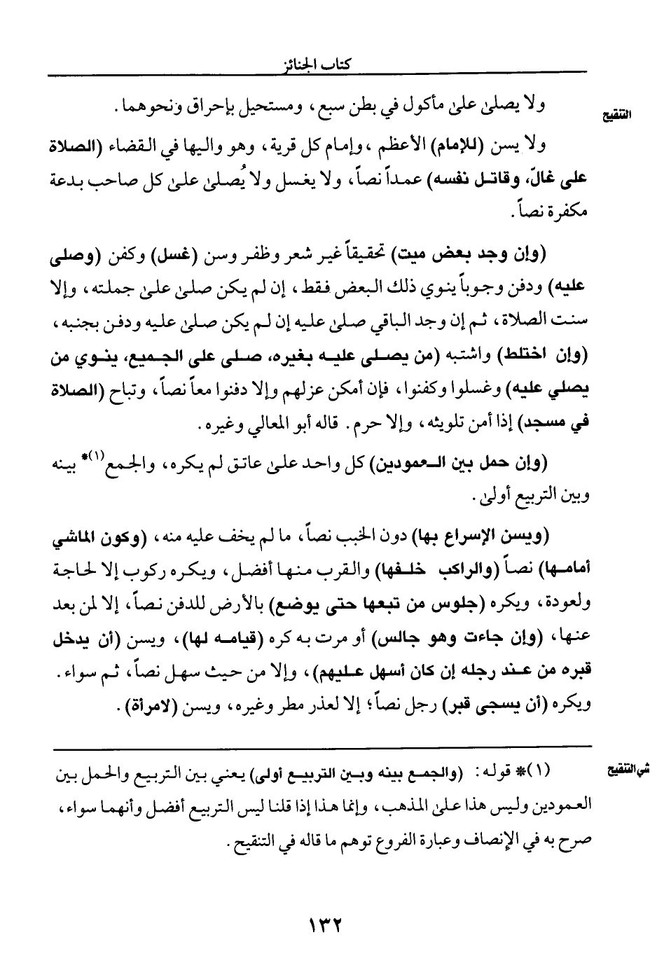 (¬١)* قوله: (والجمع بينه وبين التربيع أولى) يعني بين التربيع والحمل بين العمودين وليس هذا على المذهب، وإنما هذا إذا قلنا ليس التربيع أفضل وأنهما سواء، صرح به في الإنصاف وعبارة الفروع توهم ما قاله في التنقيح.