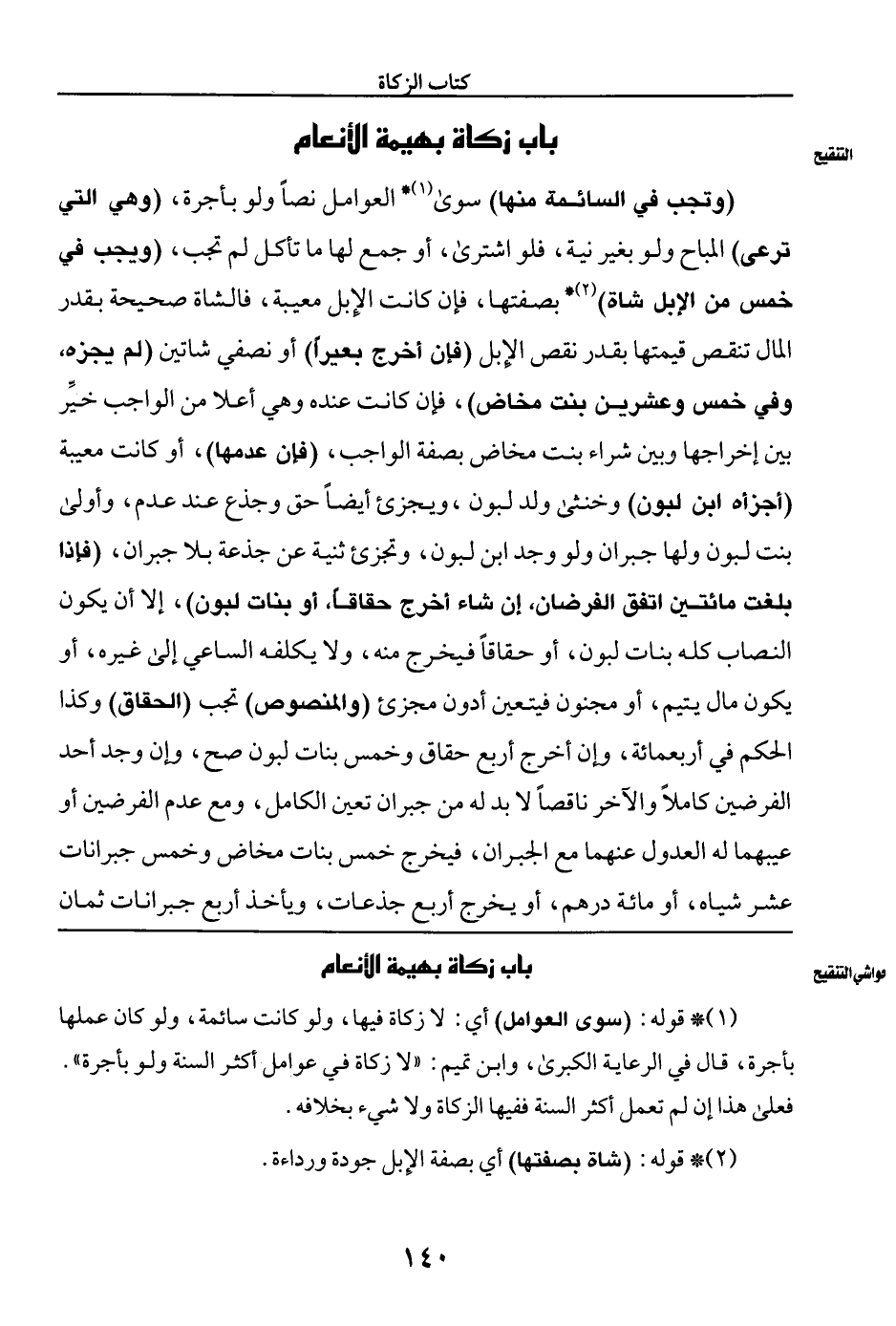 (وتجب في السائمة منها) سوى (¬١) * العوامل نصا ولو بأجرة، (وهي التي ترعى) المباح ولو بغير نية، فلو اشترى، أو جمع لها ما تأكل لم تجب، (ويجب في خمس من الإبل شاة) (¬٢) * بصفتها، فإن كانت الإبل معيبة، فالشاة صحيحة بقدر المال تنقص قيمتها بقدر نقص الإبل (فإن أخرج بعيرا) أو نصفي شاتين (لم يجزه، وفي خمس وعشرين بنت مخاض)، فإن كانت عنده وهي أعلا من الواجب خيِّر بين إخراجها وبين شراء بنت مخاض بصفة الواجب، (فإن عدمها)، أو كانت معيبة (أجزأه ابن لبون) وخنثى ولد لبون، ويجزئ أيضا حق وجذع عند عدم، وأولى بنت لبون ولها جبران ولو وجد ابن لبون، وتجزئ ثنية عن جذعة بلا جبران، (فإذا بلغت مائتين اتفق الفرضان، إن شاء أخرج حقاقا، أو بنات لبون)، إلا أن يكون النصاب كله بنات لبون، أو حقاقا فليخرج منه، ولا يكلفه الساعي إلى غيره، أو يكون مال يتيم، أو مجنون فيتعين أدون مجزئ (والمنصوص) تجب (الحقاق) وكذا الحكم في أربعمائة، وإن أخرج أربع حقاق وخمس بنات لبون صح، وإن وجد أحد الفرضين كاملا والآخر ناقصا لا بد له من جبران تعين الكامل، ومع عدم الفرضين أو عيبهما له العدول عنهما مع الجبران، فيخرج خمس بنات مخاض وخمس جبرانات عشر شياه، أو مائة درهم، أو يخرج أربع جذعات، ويأخذ أربع جبرانات ثمان