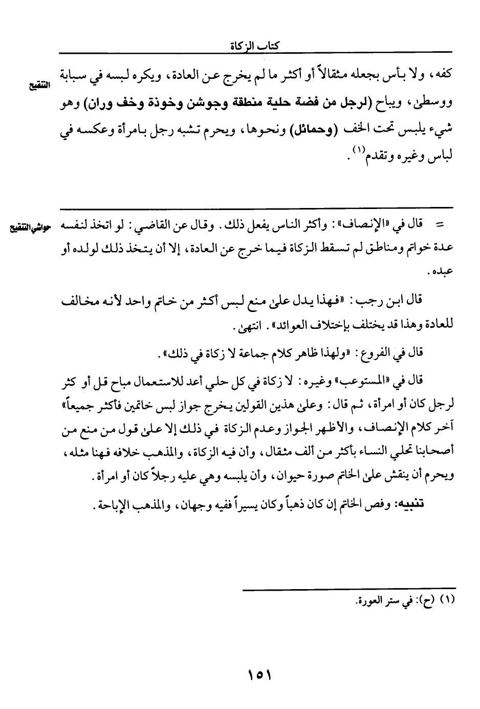 قال في "المستوعب" وغيره: لا زكاة في كل حلي أعد للاستعمال مباح قل أو كثر لرجل كان أو امرأة، ثم قال: وعلى هذين القولين يخرج جواز لبس خاتمين فأكثر جميعا" آخر كلام الإنصاف، والأظهر الجواز وعدم الزكاة في ذلك إلا على قول من منع من أصحابنا تحلي النساء بأكثر من ألف مثقال، وأن فيه الزكاة، والمذهب خلافه فهنا مثله، ويحرم أن ينقش على الخاتم صورة حيوان، وأن يلبسه وهي عليه رجلا كان أو امرأة.