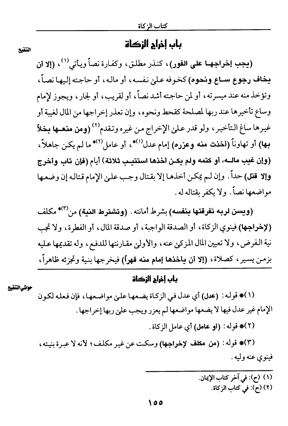 (يجب إخراجها على الفور)، كنذر مطلق، وكفارة نصا ويأتي (¬١)، (إلا أن يخاف رجوع ساع ونحوه) كخوفه على نفسه، أو ماله، أو حاجته إليها نصا، وتؤخذ منه عند مسيرته، أو لمن حاجته أشد نصا، أو لقريب، أو لجار، ويجوز لإمام وساع تأخيرها عند ربها لمصلحة كقحط ونحوه، وإن تعذر إخراجها من المال لغيبة أو غيرها ساغ التأخير، ولو قدر على الإخراج من غيره وتقدم (¬٢) (ومن منعها ببخلا بها) أو تهاونا (أخذت منه وعزره) إمام عدل (¬١) *، أو عامل (¬٢) * ما لم يكن جاهلا، (وإن غيب ماله، أو كتمه ولم يكن أخذها استتيب ثلاثة) أيام (فإن تاب وأخرج وإلا قتل) حدا. وإن لم يمكن أخذها إلا بقتال وجب على الإمام قتاله إن وضعها مواضعها نصا. ولا يكفر بفتاله له.