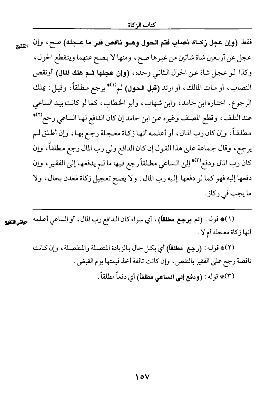 (¬١)* قوله: (لم يرجع مطلقا)، أي سواء كان الدافع رب المال، أو الساعي أعلمه أنها زكاة معجلة أم لا.