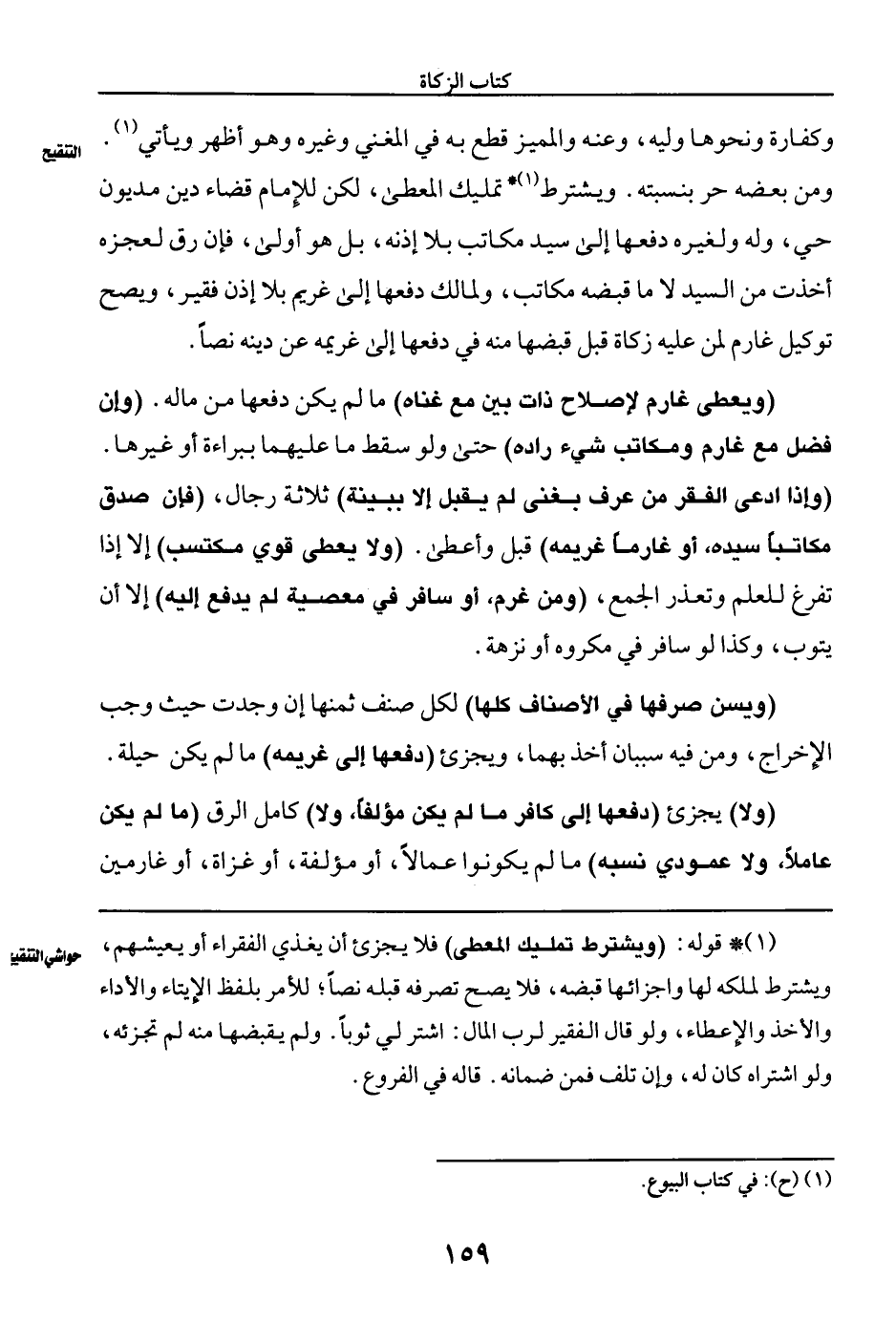 وكفارة ونحوها وليه، وعنه والمميز قطع به في المغني وغيره وهو أظهر ويأتي (¬١). ومن بعضه حر بنسبته. ويشترط (¬١) * تمليك المعطى، لكن للإمام قضاء دين مديون حي، وله ولغيره دفعها إلى سيد مكاتب بلا إذنه، بل هو أولى، فإن رق لعجزه أخذت من السيد لا ما قبضه مكاتب، ولمالك دفعها إلى غريم بلا إذن فقير، ويصح توكيل غارم لمن عليه زكاة قبل قبضها منه في دفعها إلى غريمه عن دينه نصا.