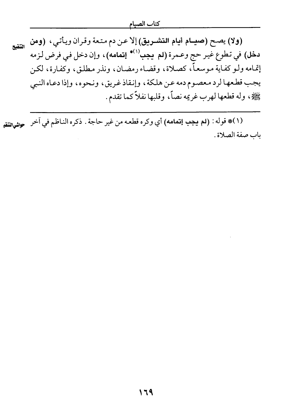 (ولا) يصح (صيام أيام التشريق) إلا عن دم متعة وقران ويأتي، (ومن دخل) في تطوع غير حج وعمرة (لم يجب (¬١) * إتمامه)، وإن دخل في فرض لزمه إتمامه ولو كفاية موسعا، كصلاة، وقضاء رمضان، ونذر مطلق، وكفارة، لكن يجب قطعها لرد معصوم دمه عن هلكة، وإنقاذ غريق، ونحوه، وإذا دعاه النبي صلى الله عليه وسلم، وله قطعها لهرب غريمه نصا، وقلبها نفلا كما تقدم.