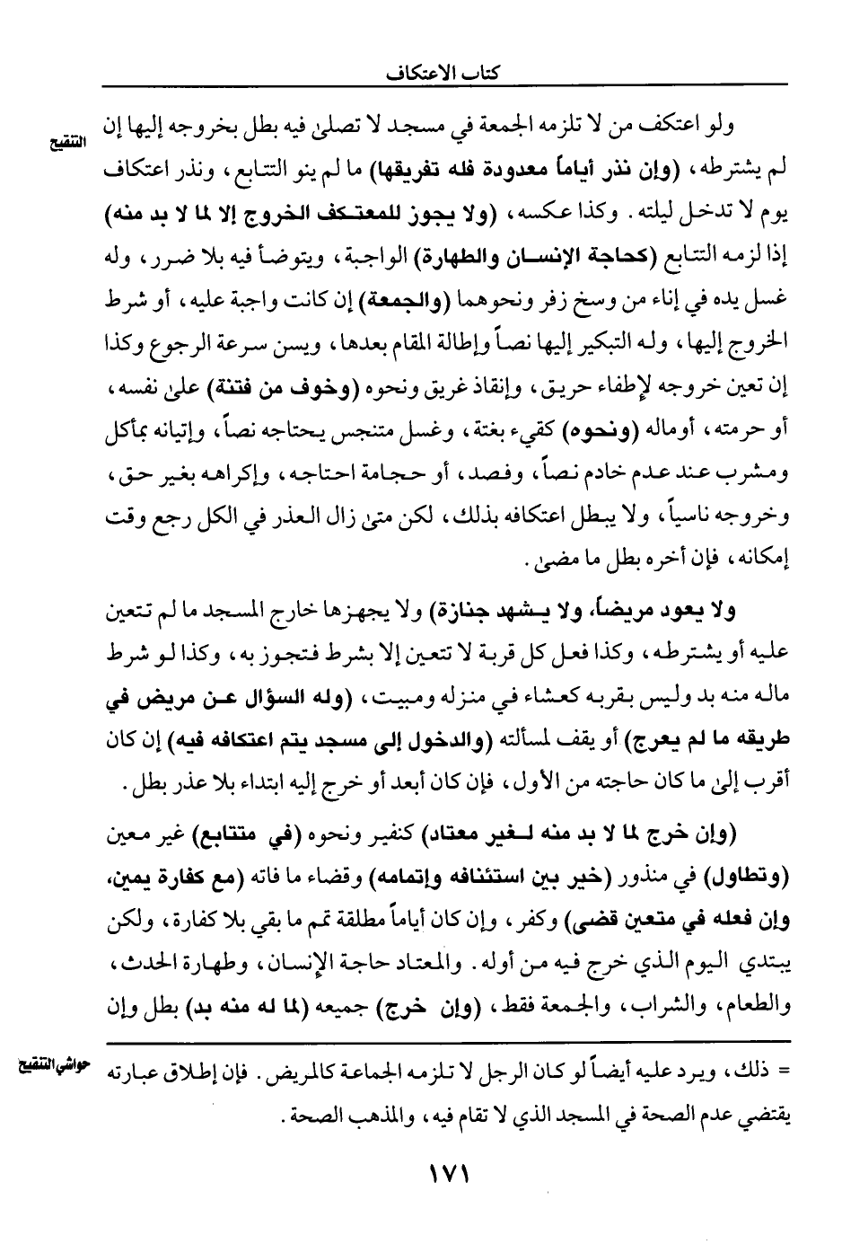 ولو اعتكف من لا تلزمه الجمعة في مسجد لا تصلى فيه بطل بخروجه إليها إن لم يشترطه، (وإن نذر أياما معدودة فله تفريقها) ما لم ينو التتابع، ونذر اعتكاف يوم لا تدخل ليلته. وكذا عكسه، (ولا يجوز للمعتكف الخروج إلا لما لا بد منه) إذا لزمه التتابع (كحاجة الإنسان والطهارة) الواجبة، ويتوضأ فيه بلا ضرر، وله غسل يده في إناء من وسخ زغر ونحوههما (والجمعة) إن كانت واجبة عليه، أو شرط الخروج إليها، وله التبكير إليها نصا وإطالة المقام بعدها، ويسن سرعة الرجوع وكذا إن تعين خروجه لإطفاء حريق، وإنقاذ غريق ونحوه (وخوف من فتنة) على نفسه، أو حرمته، أو ماله (ونحوه) كقيء بغتة، وغسل متنجس يحتاجه نصا، وإتيانه بمأكل ومشرب عند عدم خادم نصا، وفصد أو حجامة احتاجه، وإكراهه بغير حق، وخروجه ناسا، ولا يبطل اعتكافه بذلك، لكن متى زال العذر في الكل رجع وقت إمكانه، فإن أخره بطل ما مضى.
