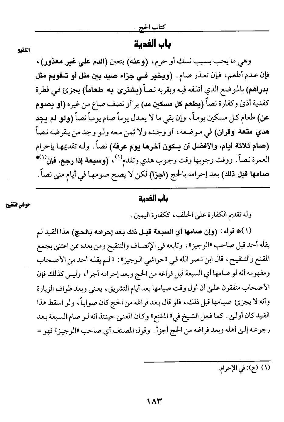 وهي ما يجب بسبب نسك أو حرم، (وعنه) يتعين (الدم على غير معذور)، فإن عدم أطعم، فإن تعذر صام. (ويخير في جزاء صيد بين مثل أو تقويم مثل بدراهم) بالموضع الذي أتلفه فيه وبقربه نصا (يشتري به طعاما) يجزئ في فطرة كفدية أذى وكفارة نصا (يطعم كل مسكين مد) بر أو نصف صاع من غيره (أو يصوم عن) طعام كل مسكين يوما، وإن بقي ما لا يعدل يوما صام يوما نصا (ولو لم يجد هدي متعة وقران) في موضعه، أو وجده ولا ثمن معه ولو وجد من يقرضه نصا (صام ثلاثة أيام، والأفضل أن يكون آخرها يوم عرفة) نصا. وله تقديمها بإحرام العمرة نصا. ووقت وجوبها وقت وجوب هدي وتقدم (¬١)، (وسبعة إذا رجع، فإن (¬١) * صامها قبل ذلك) بعد إحرامه بالحج (أجزأ) لكن لا يصح صومها في أيام منى نصا.
