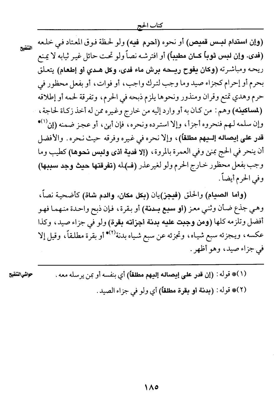 (وإن استدام لبس قميص) أو نحوه (أحرم فيه) ولو لحظة فوق المعتاد في خلعه (فدى. وإن لبس ثوبا كان مطيبا) أو افتراشه نصا ولو تحت حائل غير ثيابه لا يمنع ريحه ومباشرته (وكان يفوح ريحه برش ماء فدى، وكل هدي أو طعام) يتعلق بحرم أو إحرام كجزاء صيد وما وجب لترك واجب، أو فوات، أو بفعل محظور في حرم وهدي تمتع وقران ومنذور ونحوها يلزم ذبحه في الحرم، وتفرقة لحمه أو إطلاقه (لمساكينه) وهم: من كان به أو وارد إليه من خارج وغيره ممن له أخذ زكاة لحاجة، وإن سلمه لهم فنحروه أجزأ، وإلا استرده ونحره، فإن أبى، أو عجز ضمنه (إن (¬١) * قدر على إيصاله إليهم مطلقا)، وإلا نحره في غيره وفرقه حيث نحره. والأفضل أن ينحر في الحج بمننى وفي العمرة بالمروة، (وإلا فدية أذى ولبس نحوها) كطيب وما وجب بفعل محظور خارج الحرم ولو لغير عذر (فـ) ـله (تفرقتهاحيث وجد سببها) وفي الحرم أيضا.
