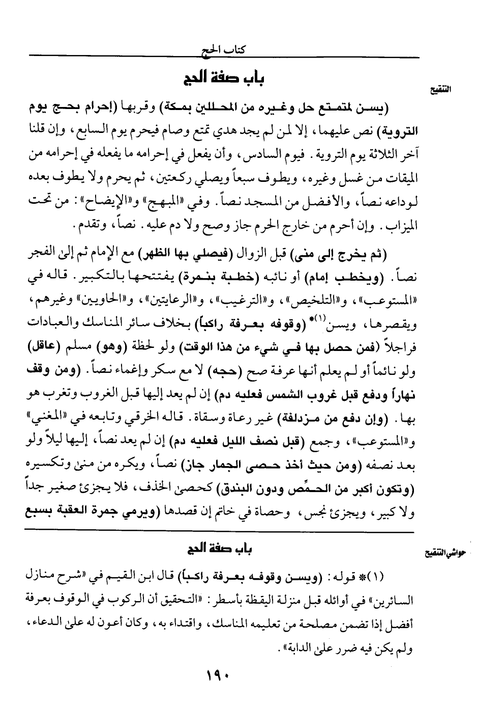 (ثم يخرج إلى منى) قبل الزوال (فيصلي بها الظهر) مع الإمام ثم إلى الفجر نصا. (ويخطب إمام) أو نائبه (خطبة بنمرة) يفتتحها بالتكبير. قاله في "المستوعب"، و"التلخيص"، و"الترغيب"، و"الرعايتين"، و"الحاويين" وغيرهم، ويقصرها، ويسن (¬١) * (وقوفه بعرفة راكبا) بخلاف سائر المناسك والعبادات فراجلا (فمن حصل بها في شيء من هذا الوقت) ولو لحظة (وهو) مسلم (عاقل) ولو نائما أو لم يعلم أنها عرفة صح (حجه) لا مع سكر وإغماء نصا. (ومن وقف نهارا ودفع قبل غروب الشمس فعليه دم) إن لم يعد إليها قبل الغروب وتغرب هو بها. (وإن دفع من مزدلفة) غير رعاة وسقاة. قاله الخرقي وتابعه في "المغني" و"المستوعب"، وجمع (قبل نصف الليل فعليه دم) إن لم يعد نصا، إليها ليلا ولو بعد نصفه (ومن حيث أخذ حصى الجمار جاز) نصا، ويكره من منى وتكسيره (وتكون أكبر من الحمِّص ودون البندق) كحصى الخذف، فلا يجزئ صغير جدا ولا كبير، ويجزئ نجس، وحصاة في خاتم إن قصدها (ويرمي جمرة العقبة بسبع
