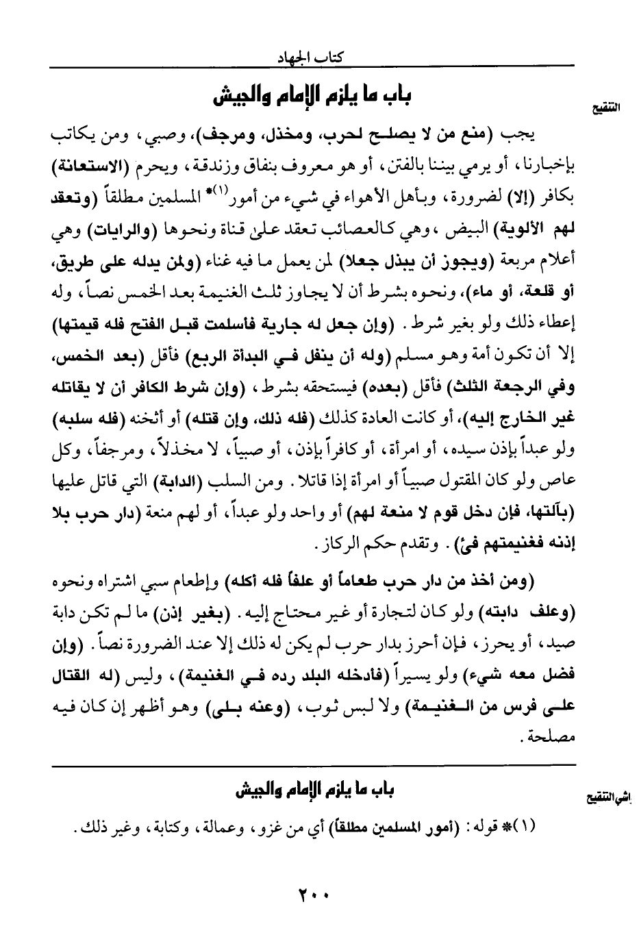 يجب (منع من لا يصلح لحرب، ومخذل، ومرجف)، وصبي، ومن يكاتب بإخبارنا، أو يرمي بيننا بالفتن، أو هو معروف بنفاق وزندقة، ويحرم (الاستعانة) بكافر (إلا) لضرورة، وبأهل الأهواء في شيء من أمور (¬١) * المسلمين مطلقا (وتعقد لهم الأولوية) البيض، وهي كالعصائب تعقد على قناة ونحوها (والرايات) وهي أعلام مربعة (ويجوز أن يبذل جعلا) لمن يعمل ما فيه غناء (ولمن يدله على طريق، أو قلعة، أو ماء)، ونحوه بشرط أن لا يجاوز ثلث الغنيمة بعد الخمس نصا، وله إعطاء ذلك ولو بغير شرط. (وإن جعل له جارية فأسلمت قبل الفتح فله قيمتها) إلا أن تكون أمة وهو مسلم (وله أن ينفل في البدأة الربع) فأقل (بعد الخمس، وفي الرجعة الثلث) فأقل (بعده) فيستحقه بشرط، (وإن شرط الكافر أن لا يقاتله غير الخارج إليه)، أو كانت العادة كذلك (فله ذلك، وإن قتله) أو أثخنه (فله سلبه) ولو عبدا بإذن سيده، أو امرأة، أو كافرا بإذن، أو صبيا، لا مخذلا، ومرجفا، وكل عاص ولو كان المقتول صبيا أو امرأة إذا قاتلا. ومن السلب (الدابة) التي قاتل عليها (بآلتها، فإن دخل قوم لا منعة لهم) أو واحدا ولو عبدا، أو لهم منعة (دار حرب بلا إذنه فغنيمتهم فئ). وتقدم حكم الركاز.