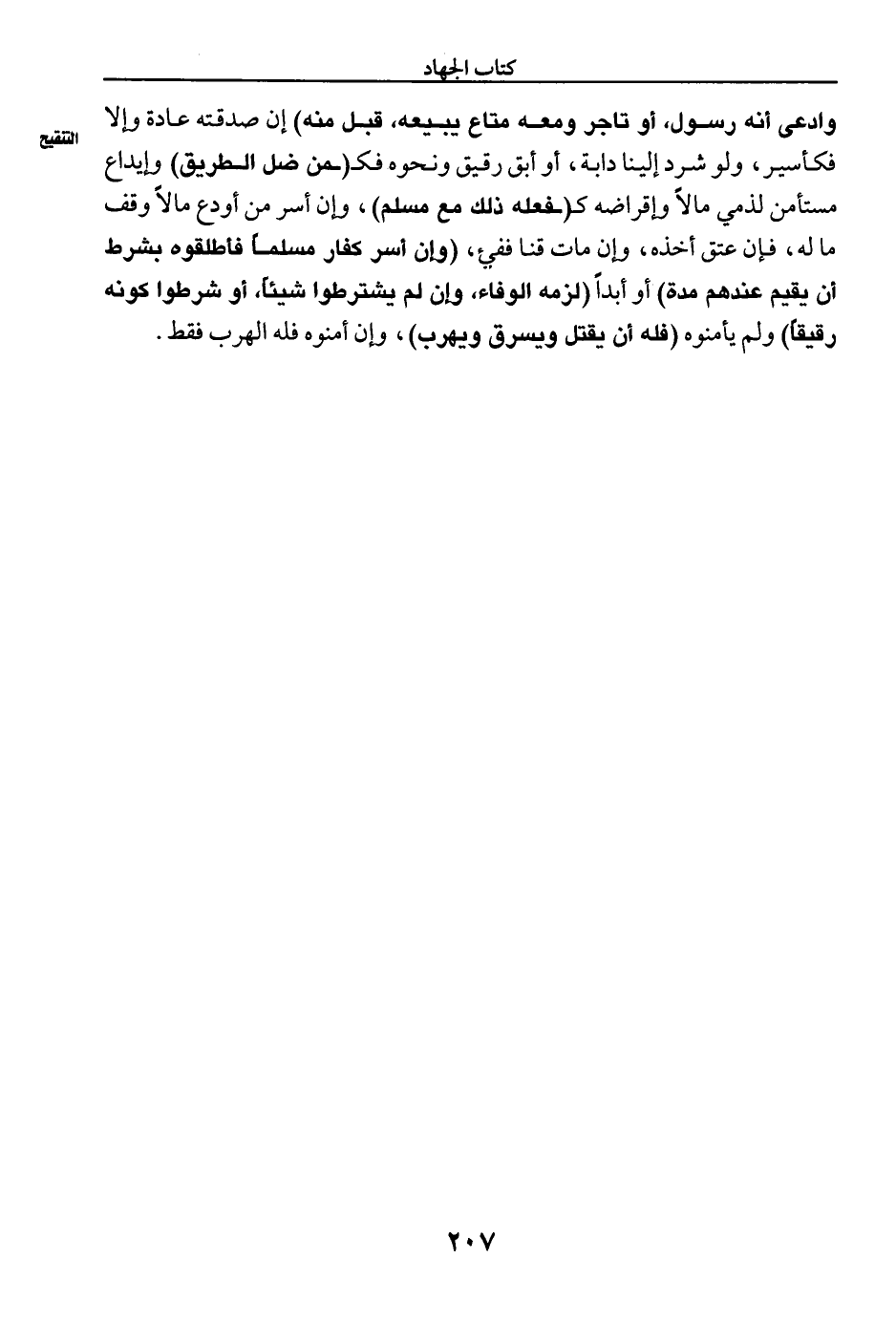 وادعى أنه رسول، أو تاجر ومعه متاع يبيعه، قبل منه) إن صدقته عادة وإلا فكأسير، ولو شرد إلينا دابة، أو أبق رقيق ونحوه فكـ (ـمن ضل الطريق) وإيداع مستأمن لذمي مالا وإقراضه كـ (ـفعله ذلك مع مسلم)، وإن أسر من أودع ملا وقف ما له، فإن عتق أخذه، وإن مات قنا ففيء، (وإن أسر كفار مسلما فأطلقوه بشرط أن يقيم عندهم مدة) أو أبدا (لزمه الوفاء، وإن لم يشترطوا شيئا، أو شرطوا كونه رقيقا) ولم يأمنوه (فله أن يقتل ويسرق ويهرب)، وإن امنوه فله الهرب فقط.