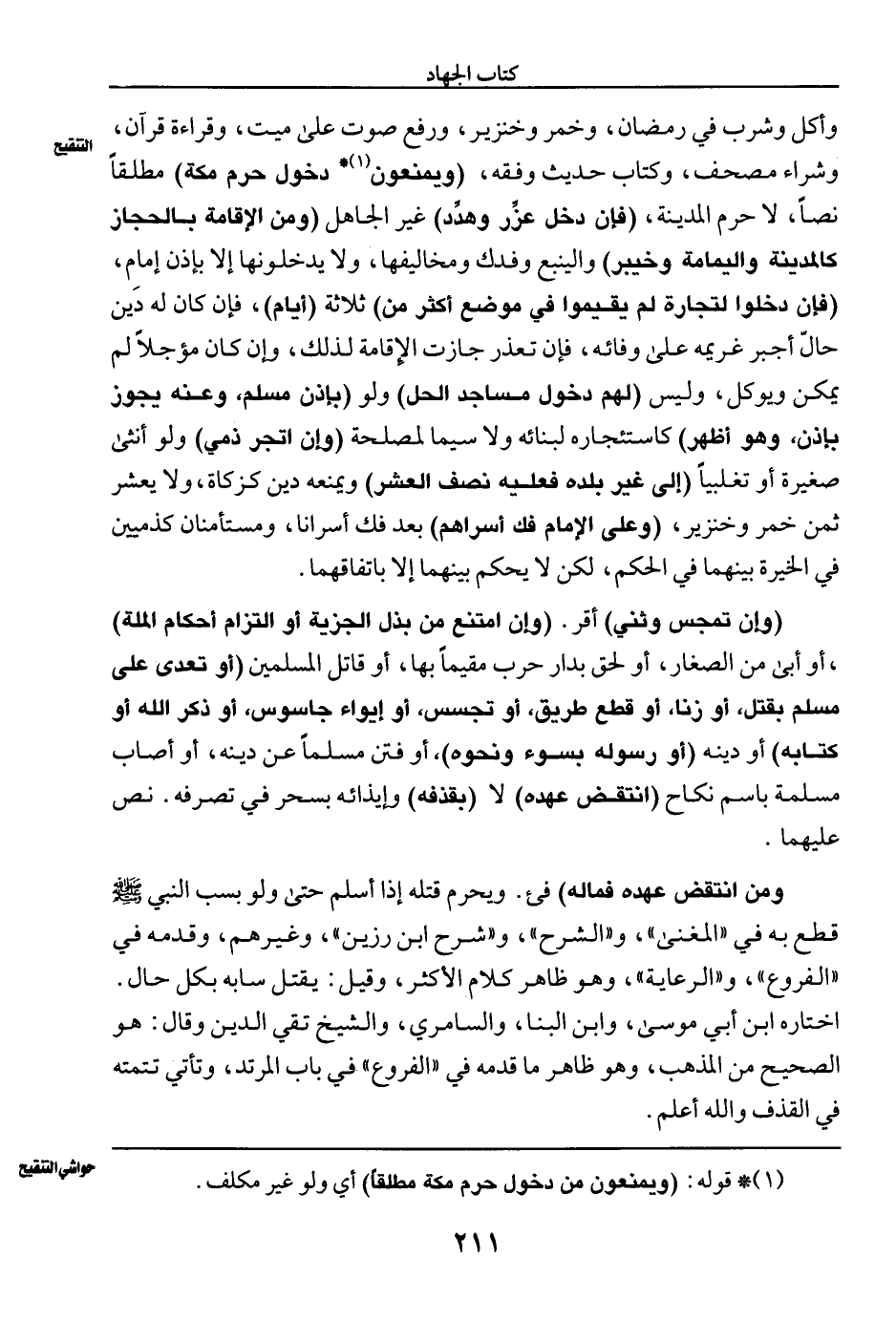 وأكل وشرب في رمضان، وخمر وخنزير، ورفع صوت على ميت، وقراءة قرآن، وشراء مصحف، وكتاب حديث وفقه، (ويمنعون (¬١) * دخول حرم مكة) مطلقا نصا، لا حرم المدينة، (فإن دخل عزِّر وهدِّد) غير الجاهل (ومن الإقامة بالحجاز كالمدينة واليمامة وخيبر) والينبع وفدك ومخالفيها، ولا يدخلونها إلا بإذن إمام، (فإن دخلوا لتجارة لم يقيموا في موضع أكثر من) ثلاثة (أيام)، فإن كان له دّين حالّ أجبر غريمه على وفائه، فإن تعذر جازت الإقامة لذلك، وإن كان مؤجلا لم يمكن ويوكل، وليس (لهم دخول مساجد الحل) ولو (بإذن مسلم، وعنه يجوز بإذن، وهو أظهر) كاستئجاره لبنائه ولا سيما لمصلحة (وإن اتجر ذمي) ولو أنثى صغيرة أو تغليبا (إلى غير بلده فعليه نصف العشر) بعد فك أسرانا، ومستأمنان كذميين في الخيرة بينهما في الحكم، لكن لا يحكم بينهما إلا باتفاقهما.
