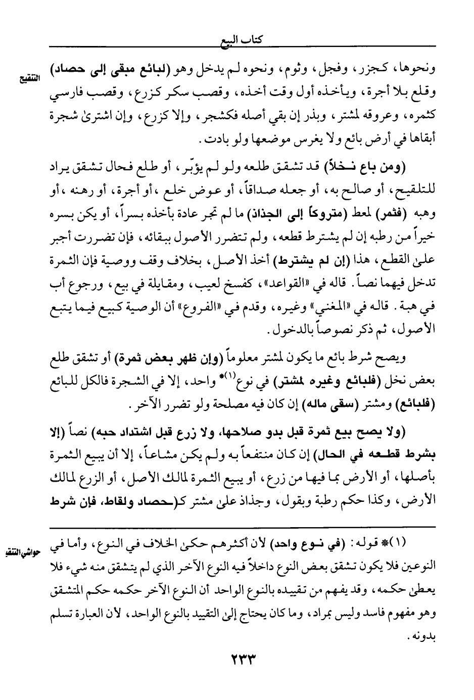 (ولا يصح بيع ثمرة قبل بدو صلاحها، ولا زرع قبل اشتداد حبه) نصًا (إلا بشرط قطعه في الحال) إن كان منتفعًا به ولم يكن مشاعًا، إلا أن يبيع الثمرة بأصلها، أو الأرض بما فيها من زرع، أو يبيع الثمرة لمالك الأصل، أو الزرع لمالك الأرض، وكذا حكم رطبة وبقول، وجذاذ على مشتر كـ (ـحصاد ولقاط، فإن شرط