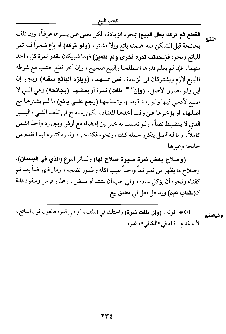 القطع ثم تركه بطل البيع) بمجرد الزيادة، لكن يعفى عن يسيرها عرفًا، وإن تلف بجائحة قبل التمكن منه ضمنه بائع وإلا مشتر، (ولو تركه) أو باع شجرًا فيه ثمر للبائع ونحوه فـ (ـحدثت ثمرة أخرى ولم تتميز) فهما شريكان بقدر ثمرة كل واحد منهما، فإن لم يعلم قدرها اصطلحا والبيع صحيح، وإن آخر قطع خشب مع شرطه فالبيع لازم ويشتركان في الزيادة. نص عليهما، (ويلزم البائع سقيه) ويجبر إن أبى ولو تضرر الأصل، (وإن (¬١) * تلفت) ثمرة أو بعضها (بجائحة) وهي التي لا صنع لآدمي فيها ولو بعد قبضها وتسلمها (رجع على بائع) ما لم يشترها مع أصلها، أو يؤخرها عن وقت أخذها المعتاد، لكن يسامح في تلف الشيء اليسير الذي لا ينضبط نصًا، ولو تعيبت به خير بين إمضاء مع أرش وبين رد وأخذ الثمن كاملًا، وما له أصل يتكرر حمله كقثاء ونحوه فكشجر، وثمره كثمره فيما تقدم من جائحة وغيرها.