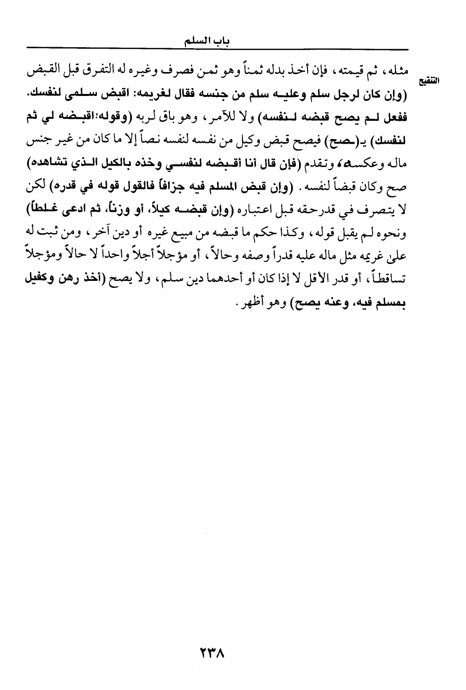 مثله، ثم قيمته، فإن أخذ بدله ثمنًا وهو ثمن فصرف وغيره له التفرق قبل القبض (وإن كان لرجل سلم وعليه سلم من جنسه فقال لغريمه: اقبض سلمى لنفسك. ففعل لم يصح قبضه لنفسه) ولا للآمر، وهو باق لربه (وقوله: اقبضه لي ثم لنفسك) يـ (ـصح) فيصح قبض وكيل من نفسه لنفسه نصًا إلا ما كان من غير جنس ماله وعكسه، وتقدم (فإن قال أنا أقبضه لنفسي وخذه بالكيل الذي تشاهده) صح وكان قبضًا لنفسه. (وإن قبض المسلم فيه جزافًا فالقول قوله في قدره) لكن لا يتصرف في قدر حقه قبل اعتباره (وإن قبضه كيلًا، أو وزنًا، ثم ادعى غلطًا) ونحوه لم يقبل قوله، وكذا حكم ما قبضه من مبيع غيره أو دين آخر، ومن ثبت له على غريمه مثل ماله عليه قدرًا وصفه وحالًا، أو مؤجلًا أجلًا واحدًا لا حالًا ومؤجلًا تساقطًا، أو قدر الأقل لا إذا كان أو أحدهما دين سلم، ولا يصح (أخذ رهن وكفيل بمسلم فيه، وعنه يصح) وهو أظهر.