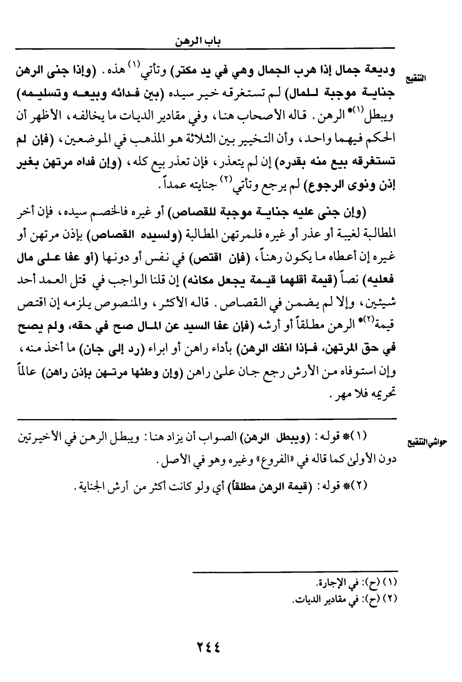 (وإن جنى عليه جناية موجبة للقصاص) أو غيره فالخصم سيده، فإن أخر المطالبة لغيبة أو عذر أو غيره فلمرتهن المطالبة (ولسيده القصاص) بإذن مرتهن أو غيره إن أعطاه ما يكون رهنًا، (فإن اقتص) في نفس أو دونها (أو عفا على مال فعليه) نصًا (قيمة أقلهما قيمة يجعل مكانه) إن قلنا الواجب في قتل العمد أحد شيئين، وإلا لم يضمن في القصاص. قاله الأكثر، والمنصوص يلزمه إن اقتص قيمة (¬٢) * الرهن مطلقًا أو أرشه (فإن عفا السيد عن المال صح في حقه، ولم يصح في حق المرتهن، فإذا انفك الرهن) بأداء راهن أو ابراء (رد إلى جان) ما أخذ منه، وإن استوفاه من الأرش رجع جان على راهن (وإن وطئها مرتهن بإذن راهن) عالمًا تحريمه فلا مهر.