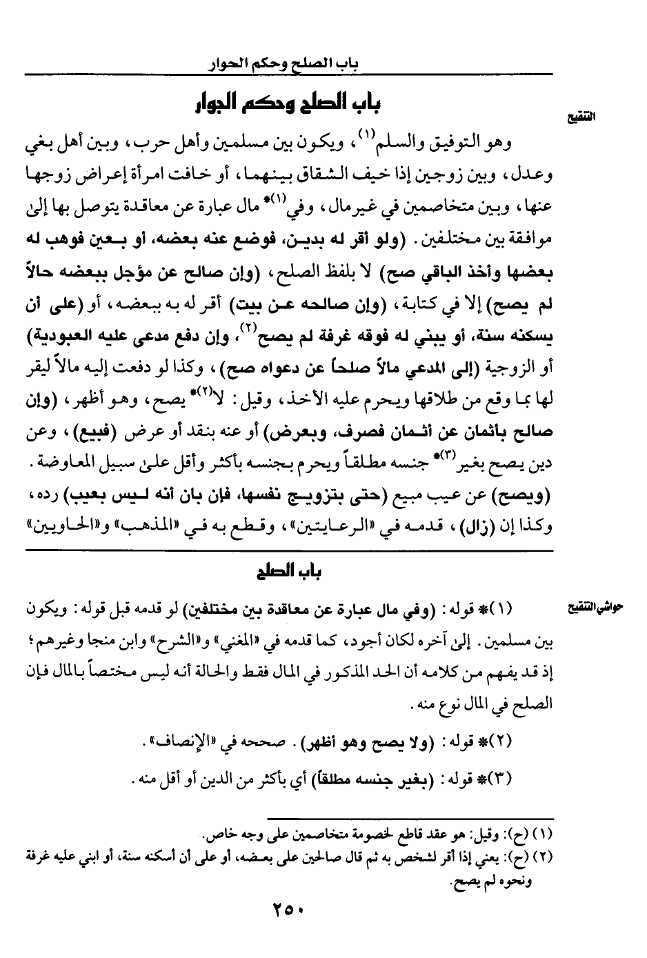 (¬١) * قوله: (وفي مال عبارة عن معاقدة بين مختلفين) لو قدمه قبل قوله: ويكون بين مسلمين. إلى آخره لكان أجود، كما قدمه في "المغني" و"الشرح" وابن منجا وغيرهم؛ إذ قد يفهم من كلامه أن الحد المذكور في المال فقط والحالة أنه ليس مختصًا بالمال فإن الصلح في المال نوع منه.