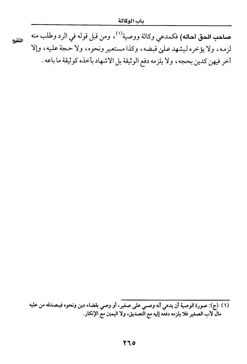 (¬١) (ح): صورة الوصية أن يدعى أنه وصي على صغير، أو وصي بقضاء دين ونحوه فيصدقه من عليه مال لأب الصغير فلا يلزمه دفعه إليه مع التصديق، ولا اليمين مع الإنكار.