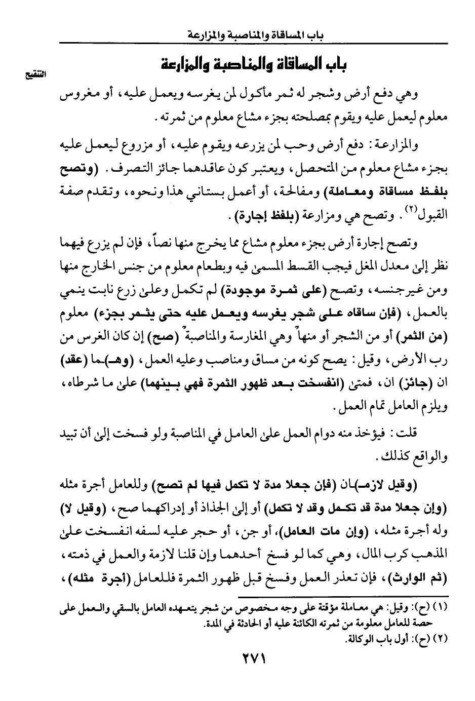 (¬١) (ح): وقيل: هي معاملة مؤقتة على وجه مخصوص من شجر يتعهده العامل بالسقي والعمل على حصة للعامل معلومة من ثمرته الكائنة عليه أو الحادثة في المدة.