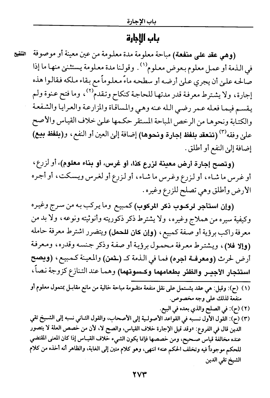 (وهي عقد على منفعة) مباحة معلومة مدة معلومة من عين معينة أو موصوفة في الذمة أو عمل معلوم بعوض معلوم (¬١). وقولنا مدة معلومة يستثنى منها ما إذا صالحه على أن يجري على أرضه أو سطحه ماءً معلومًا مع بقاء ملكه فقالوا هذه إجارة، ولا يشترط معرفة قدر مدتها للحاجة كنكاح وتقدم (¬٢)، وما فتح عنوة ولم يقسم فيما فعله عمر - رضي الله عنه - وهي والمساقاة والمزارعة والعرايا والشفعة والكتابة ونحوها من الرخص المباحة المستقر حكمها على خلاف القياس والأصح على وفقه (¬٣) (تنعقد بلفظ إجارة ونحوها) إضافة إلى العين أو النفع، و (بلفظ بيع) إضافة إلى النفع أو أطلق.