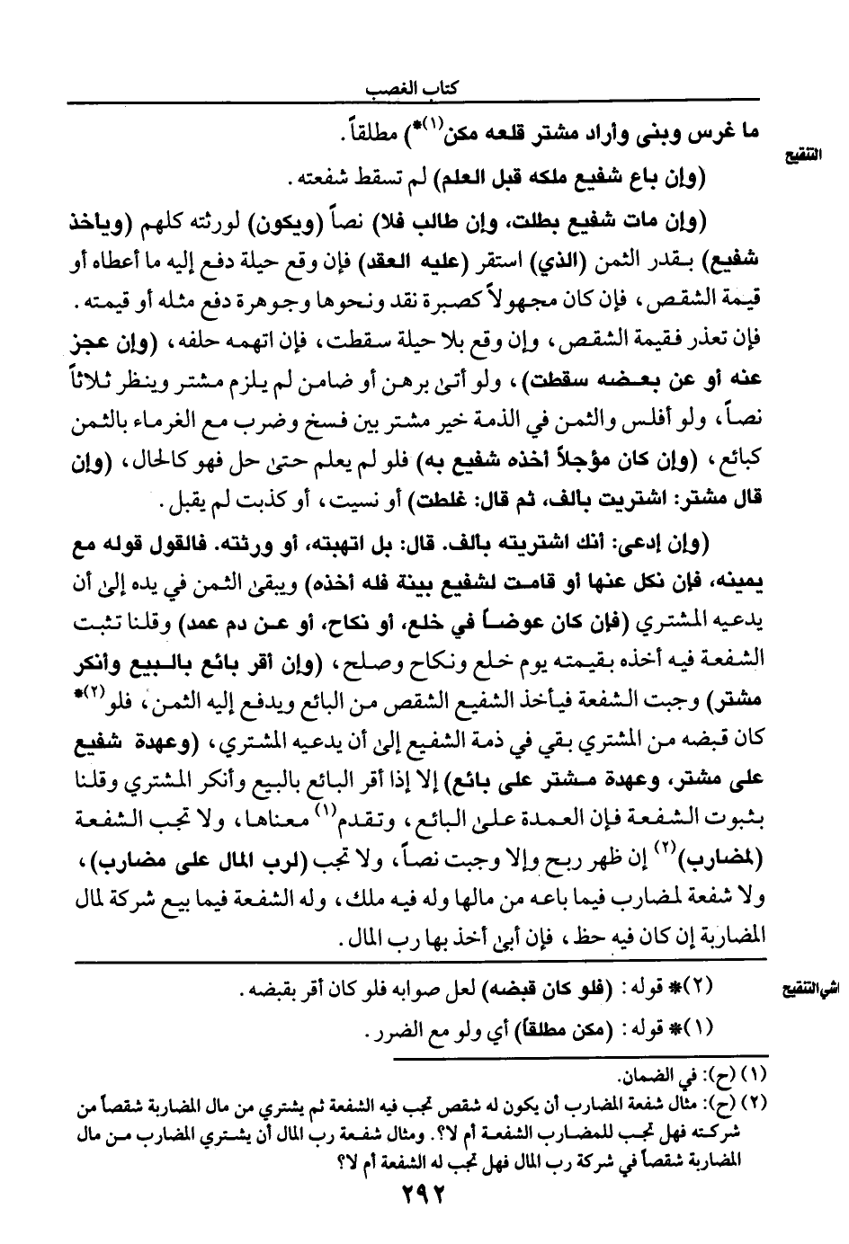 (¬٢) (ح): مثال شفعة المضارب أن يكون له شقص تجب فيه الشفعة ثم يشتري من مال المضاربة شقصًا من شركته فهل تجب للمضارب الشفعة أم لا؟. ومثال شفعة رب المال أن يشتري المضارب من مال المضاربة شقصًا في شركة رب المال فهل تجب له الشفعة أم لا؟
