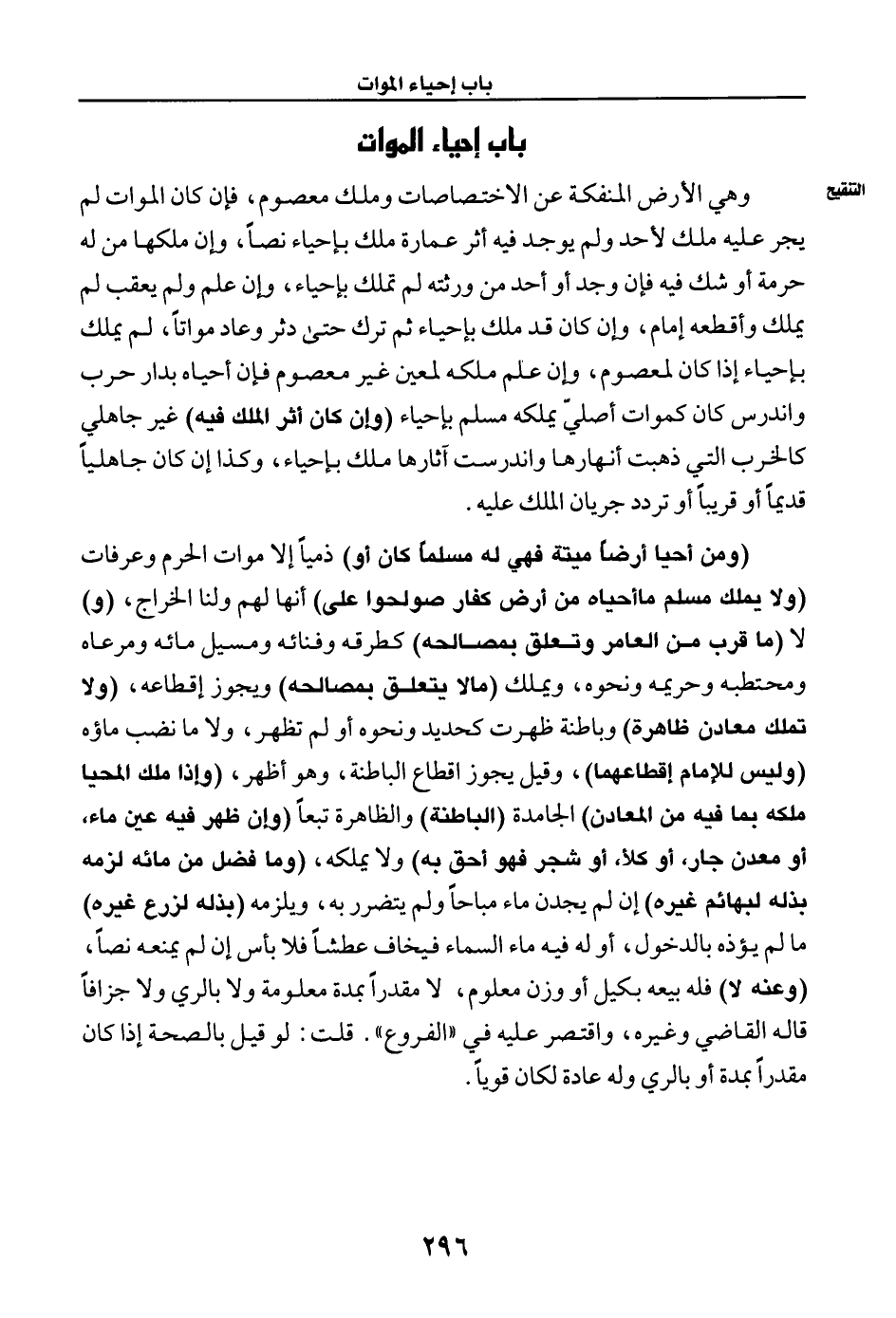 وهي الأرض المنفكة عن الاختصاصات وملك معصوم، فإن كان الموات لم يجر عليه ملك لأحد ولم يوجد فيه أثر عمارة ملك بإحياء نصًا، وإن ملكها من له حرمة أو شك فيه فإن وجد أو أحد من ورثته لم تملك بإحياء، وإن علم ولم يعقب لم يملك وأقطعه إمام، وإن كان قد ملك بإحياء ثم ترك حتى دثر وعاد مواتًا، لم يملك بإحياء إذا كان لمعصوم، وإن علم ملكه لمعين غير معصوم فإن أحياه بدار حرب واندرس كان كموات أصليّ يملكه مسلم بإحياء (وإن كان أثر الملك فيه) غير جاهلي كالخرب التي ذهبت أنهارها واندرست آثارها ملك بإحياء، وكذا إن كان جاهليًا قديمًا أو قريبًا أو تردد جريان الملك عليه.