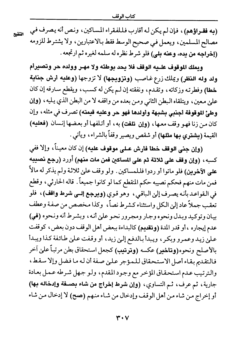 (وإن جنى الوقف خطأ فأرش على موقوف عليه) إن كان معينًا، وإلا ففي كسبه، (وإن وقف على ثلاثة ثم على المساكين فمن مات منهم) أورد (رجع نصيبه على الآخرين) فلو ماتوا أو ردوا فللمساكين. ولو وقف على ثلاثة ولم يذكر له مالًا فمن مات منهم فحكم نصيبه حكم المنقطع كما لو كانوا جميعًا. قاله الحارثي، وقطع في القواعد بأنه يصرف إلى الباقي، وهو قوي (ويرجع إلى شرط واقف)، فلو تعقب جملًا عاد إلى الكل واستثناء كشرط نصًا، وكذا مخصص من صفة وعطف بيان وتوكيد وبدل ونحوه وجار ومجرور نحو على أنه، وبشرط أنه ونحوه (في) عدم إيجاره، أو قدر المدة (وتقديم) كالبداءة ببعض أهل الوقف دون بعض، كوقفت على زيد وعمرو وبكر، ويبدأ بالدفع إلى زيد، أو وقفت على طائفة كذا ويبدأ بالأصلح ونحوه (وتأخير) عكسه (وترتيب) كجعل استحقاق بطن مرتبًا على آخر فالتقديم بقاء أصل الاستحقاق للمؤجر على صفة أن له ما فضل وإلا سقط، والترتيب عدم استحقاق المؤخر مع وجود المقدم، ولو جهل شرطه عمل بعادة جارية، ثم عرف، ثم التساوي، (وإن شرط إخراج من شاء بصفة وإدخاله بها) أو إخراج من شاء من أهل الوقف وإدخال من شاء منهم (صح) لا إدخال من شاء