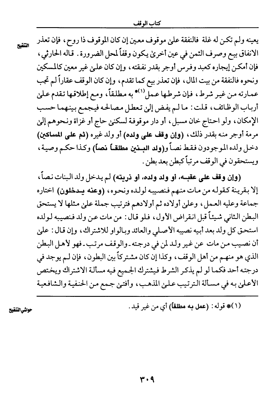 يعينه ولم تكن له غلة فالنفقة على موقوف معين إن كان الموقوف ذا روح، فإن تعذر الإنفاق بيع وصرف الثمن في عين أخرى يكون وقفًا لمحل الضرورة. قاله الحارثي، فإن أمكن إيجاره كعبد وفرس أوجر بقدر نفقته، وإن كان على غير معين كالمسكين ونحوه فالنفقة من بيت المال، فإن تعذر بيع كما تقدم، وإن كان الوقف عقارًا لم تجب عمارته من غير شرط، فإن شرطها عمل (¬١) * به مطلقًا، ومع إطلاقها تقدم على أرباب الوظائف، قلت: ما لم يفض إلى تعطل مصالحه فيجمع بينهما حسب الأمكان، ولو احتاج خان مسبل، أو دار موقوفة لسكنى حاج أو غزاة ونحوهم إلى مرمة أوجر منه بقدر ذلك، (وإن وقف على ولده) أو ولد غيره (ثم على المساكين) دخل ولده الموجودون فقط نصًا و (ولد البنين مطلقًا نصًا) وكذا حكم وصية، ويستحقون في الوقف مرتبًا كبطن بعد بطن.