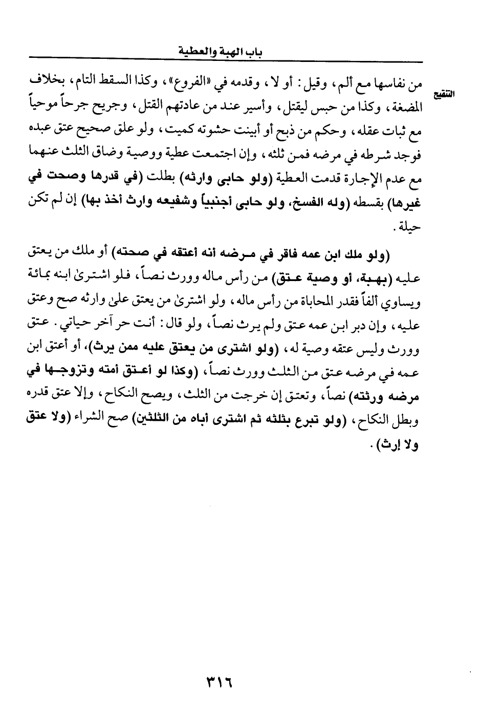 من نفاسها مع ألم، وقيل: أو لا، وقدمه في "الفروع"، وكذا السقط التام، بخلاف المضغة، وكذا من حبس ليقتل، وأسير عند من عادتهم القتل، وجريح جرحًا موحيًا مع ثبات عقله، وحكم من ذبح أو أبينت حشوته كميت، ولو علق صحيح عتق عبده فوجد شرطه في مرضه فمن ثلثه، وإن اجتمعت عطية ووصية وضاق الثلث عنهما مع عدم الإجارة قدمت العطية (ولو حابى وارثه) بطلت (في قدرها وصحت في غيرها) بقسطه (وله الفسخ، ولو حابى أجنبيًا وشفيعه وارت أخذ بها) إن لم تكن حيلة.
