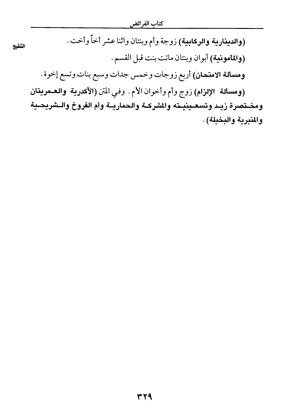 (ومسالة الإلزام) زوج وأم وأخوان الأم. وفي المتن (الأكدرية والعمريتان ومختصرة زيد وتسعينيته والمشركة والحمارية وأم الفروخ والشريحية والمنبرية والبخيلة).