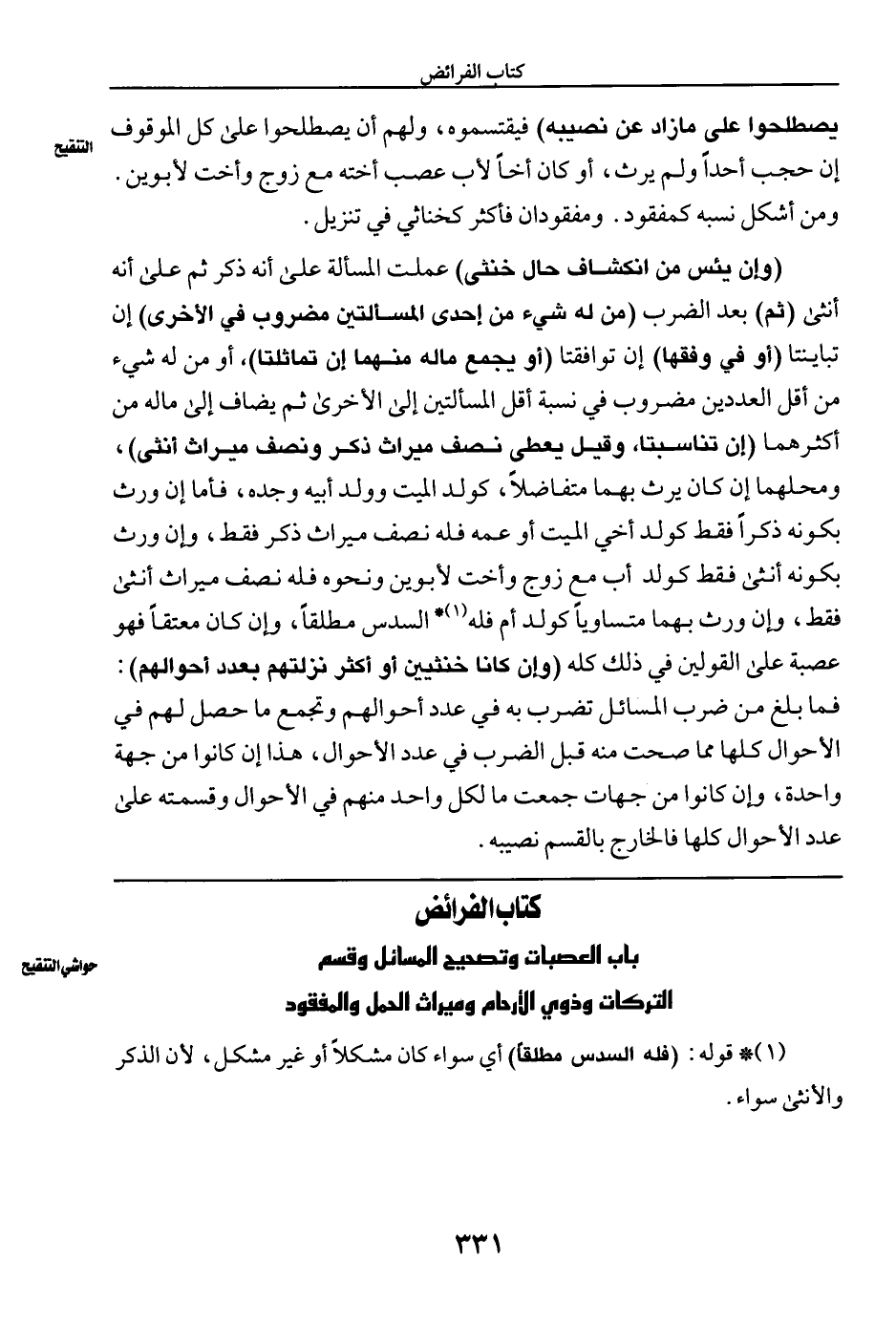 (وإن يئس من انكشاف حال خنثى) عملت المسألة على أنه ذكر ثم على أنه أنثى (ثم) بعد الضرب (من له شيء من إحدى المسألتين مضروب في الأخرى) إن تباينتا (أو في وفقها) إن توافقتا (أو يجمع ماله منهما إن تماثلتا)، أو من له شيء من أقل العددين مضروب في نسبة أقل المسألتين إلى الأخرى ثم يضاف إلى ماله من أكثرهما (إن تناسبتا، وقيل يعطى نصف ميراث ذكر ونصف ميراث أنثى)، ومحلهما إن كان يرث بهما متفاضلًا، كولد الميت وولد أبيه وجده، فأما إن ورث بكونه ذكرًا فقط كولد أخي الميت أو عمه فله نصف ميراث ذكر فقط، وإن ورث بكونه أنثى فقط كولد أب مع زوج وأخت لأبوين ونحوه فله نصف ميراث أنثى فقط، وإن ورث بهما متساويًا كولد أم فله (¬١) * السدس مطلقًا، وإن كان معتقًا فهو عصبة على القولين في ذلك كله (وإن كانا خنثيين أو أكثر نزلتهم بعدد أحوالهم): فما بلغ من ضرب المسائل تضرب به في عدد أحوالهم وتجمع ما حصل لهم في الأحوال كلها مما صحت منه قبل الضرب في عدد الأحوال، هذا إن كانوا من جهة واحدة، وإن كانوا من جهات جمعت ما لكل واحد منهم في الأحوال وقسمته على عدد الأحوال كلها فالخارج بالقسم نصيبه.