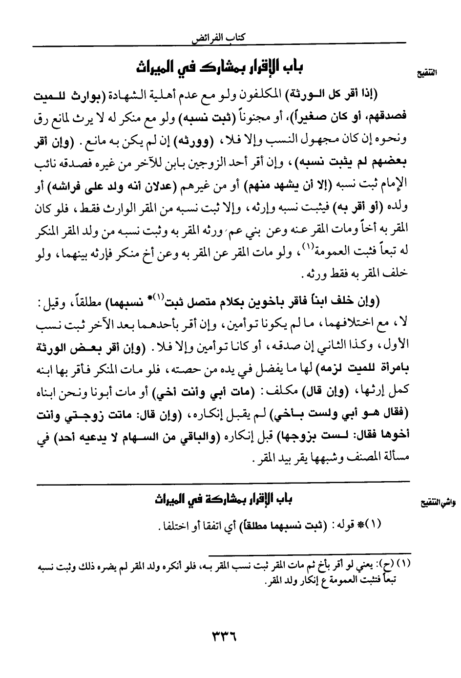 (¬١) (ح): يعني لو أقر بأخ ثم مات المقر ثبت نسب المقر به، فلو أنكره ولد المقر لم يضره ذلك وثبت نسبه تبعًا فتثبت العمومة ع إنكار ولد المقر.