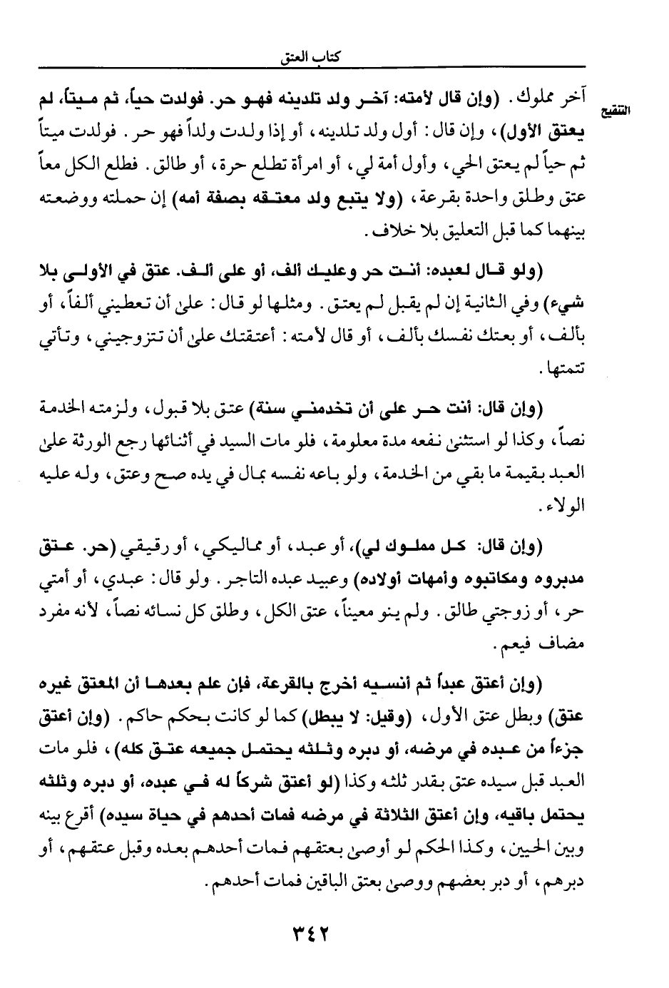 (وإن قال: كل مملوك لي)، أو عبد، أو مماليكي، أو رقيقي (حر. عتق مدبروه ومكاتبوه وأمهات أولاده) وعبيد عبده التاجر. ولو قال: عبدي، أو أمتي حر، أو زوجتي طالق. ولم ينو معينًا، عتق الكل، وطلق كل نسائه نصًا؛ لأنه مفرد مضاف فيعم.