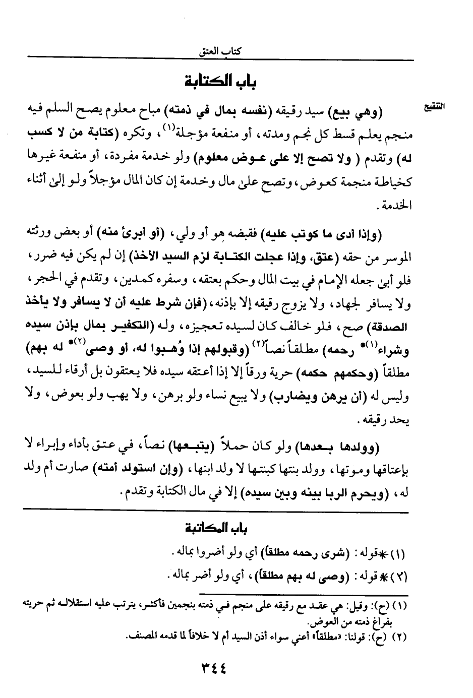 (¬١) (ح): وقيل: هي عقد مع رقيقه على منجم في ذمته بنجمين فأكثر، يترتب عليه استقلاله ثم حريته بفراغ ذمته من العوض.