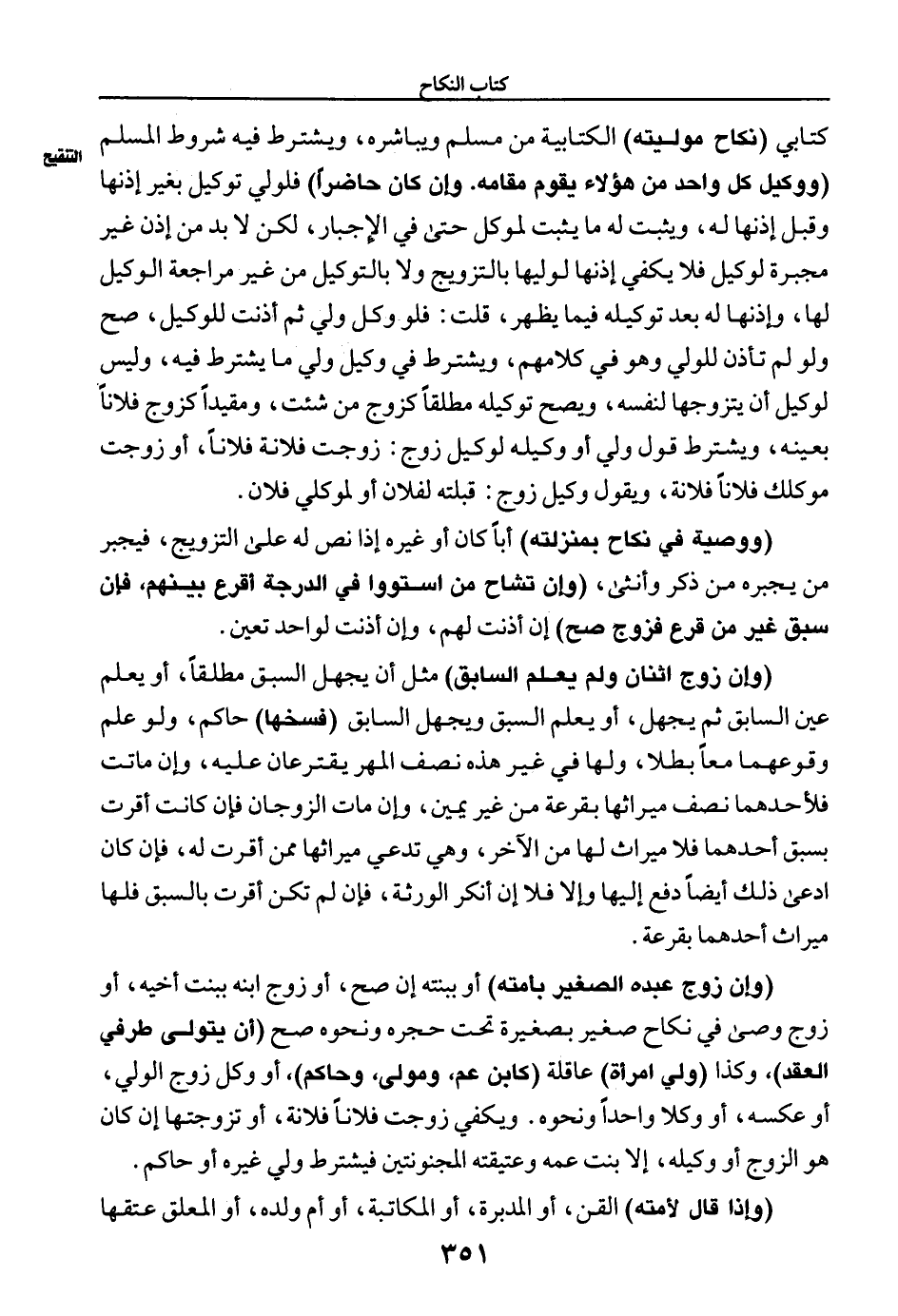 كتابي (نكاح موليته) الكتابية من مسلم ويباشره، ويشترط فيه شروط المسلم (ووكيل كل واحد من هؤلاء يقوم مقامه. وإن كان حاضرًا) فلولي توكيل بغير إذنها وقبل إذنها له، ويثبت له ما يثبت لموكل حتى في الإجبار، لكن لا بد من إذن غير مجبرة لوكيل فلا يكفي إذنها لوليها بالتزويج ولا بالتوكيل من غير مراجعة الوكيل لها، وإذنها له بعد توكيله فيما يظهر، قلت: فلو وكل ولي ثم أذنت للوكيل، صح ولو لم تأذن للولي وهو في كلامهم، ويشترط في وكيل ولي ما يشترط فيه، وليس لوكيل أن يتزوجها لنفسه، ويصح توكيله مطلقًا كزوج من شئت، ومقيدًا كزوج فلانًا بعينه، ويشترط قول ولي أو وكيله لوكيل زوج: زوجت فلانة فلانًا، أو زوجت موكلك فلانًا فلانة، ويقول وكيل زوج: قبلته لفلان أو لموكلي فلان.