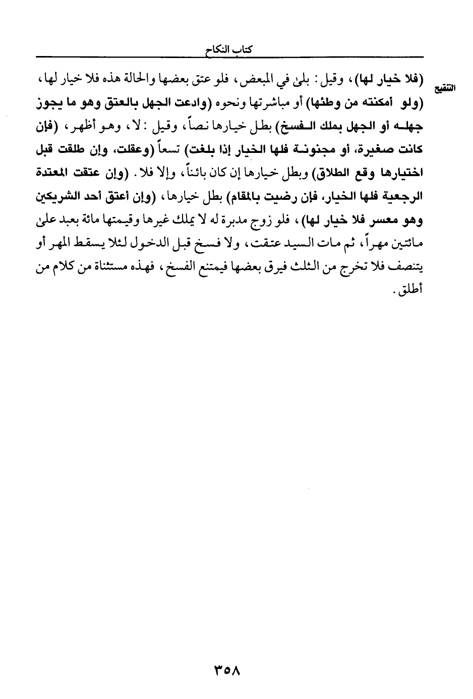 (فلا خيار لها)، وقيل: بلى فى المبعض، فلو عتق بعضها والحالة هذه فلا خيار لها، (ولو أمكنته من وطئها) أو مباشرتها ونحوه (وادعت الجهل بالعتق وهو ما يجوز جهله أو الجهل بملك الفسخ) بطل خيارها نصًا، وقيل: لا، وهو أظهر، (فإن كانت صغيرة، أو مجنونة فلها الخيار إذا بلغت) تسعًا (وعقلت، وإن طلقت قبل اختيارها وقع الطلاق) وبطل خيارها إن كان بائنًا، وإلا فلا. (وإن عتقت المعتدة الرجعية فلها الخيار، فإن رضيت بالمقام) بطل خيارها، (وإن أعتق أحد الشريكين وهو معسر فلا خيار لها)، فلو زوج مدبرة له لا يملك غيرها وقيمتها مائة بعبد على مائتين مهرًا، ثم مات السيد عتقت، ولا فسخ قبل الدخول لئلا يسقط المهر أو يتنصف فلا تخرج من الثلث فيرق بعضها فيمتنع الفسخ، فهذه مستثناة من كلام من أطلق.