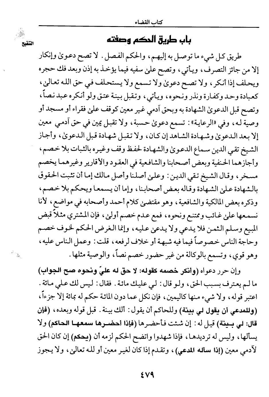 طريق كل شيء ما توصل به إليهم، والحكم الفصل. لا تصح دعوى وإنكار إلا من جائز التصرف، ويأتي، وتصح على سفيه فيما يؤخذ به إذن وبعد فك حجره ويحلف إذا أنكر، ولا تصح دعوى ولا تسمع ولا يستحلف في حق الله تعالى، كعبادة وحد وكفارة ونذر ونحوه، ويأتي، وتقبل بينة عتق ولو أنكره عبد نصًا، وتصح قبل الدعوى الشهادة به وبحق آدمي غير معين كوقف على فقراء أو مسجد أو وصية له، وفي "الرعاية": تسمع دعوى حسبة، ولا تقبل يمين في حق آدمي معين إلا بعد الدعوى وشهادة الشاهد إن كان، ولا تقبل شهادة قبل الدعوى، وأجاز الشيخ تقي الدين سماع الدعوى والشهادة لحفظ وقف وغيره بالثبات بلا خصم، وأجازهما الحنفية وبعض أصحابنا والشافعية في العقود والأقارير وغيرهما يخصم مسخر، وقال الشيخ تقي الدين: وعلى أصلنا وأصل مالك إما أن تثبت الحقوق بالشهادة على الشهادة وقاله بعض أصحابنا، وإما أن يسمعا ويحكم بلا خصم، وذكره بعض المالكية والشافعية، وهو مقتضى كلام أحمد وأصحابه في مواضع؛ لأنا نسمعها على غائب وممتنع ونحوه، فمع عدم خصم أولى، فإن المشتري مثلًا قبض المبيع وسلم الثمن فلا يدعي ولا يدعى عليه، وإنما الغرض الحكم لخوف خصم وحاجة الناس خصوصًا فيما فيه شبهة أو خلاف لرفعه، قلت: وعمل الناس عليه، وهو قوي، وتسمع بالوكالة من غير حضور خصم نصًا، والوصية مثلها.