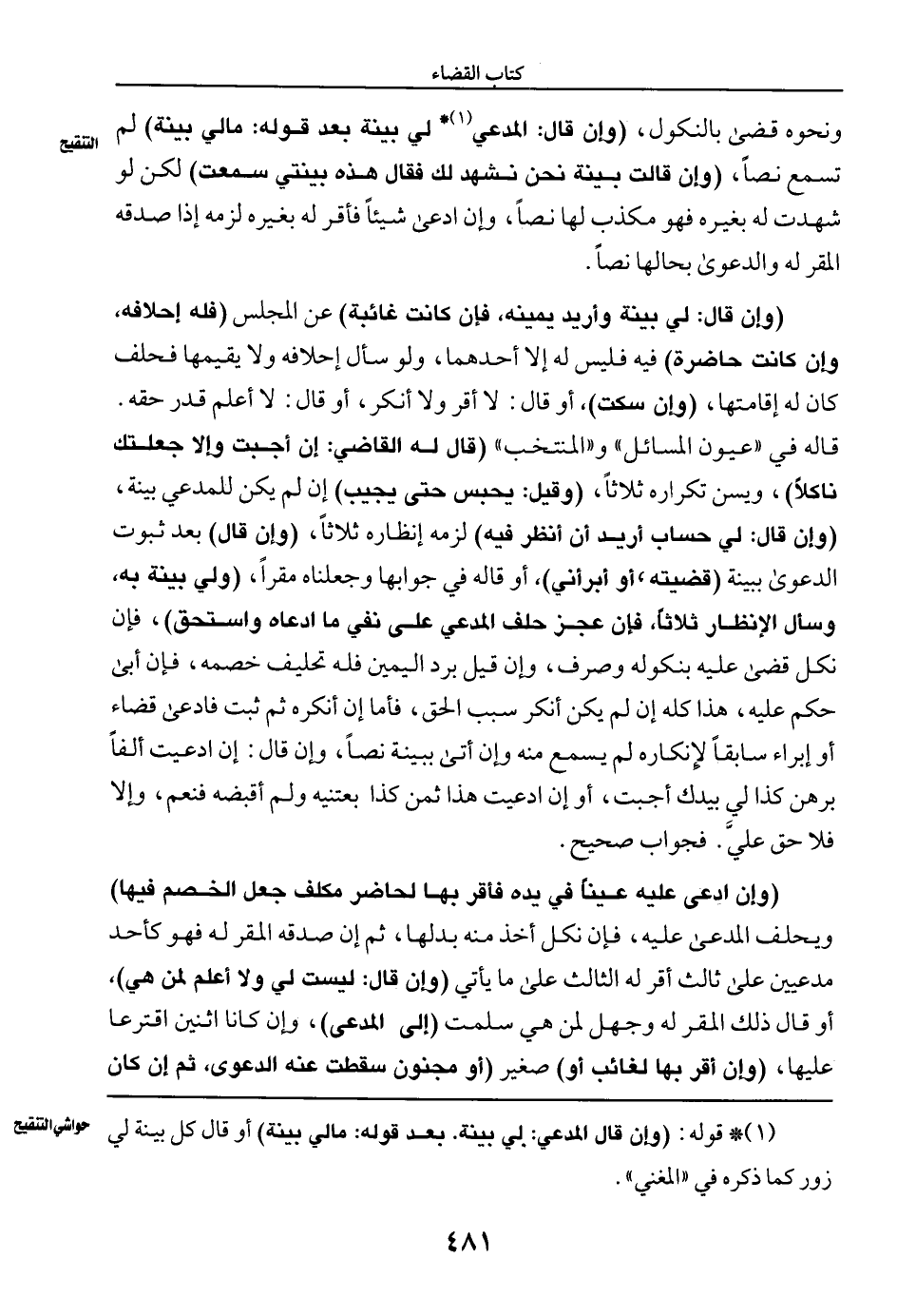 (وإن قال: لي بينة وأريد يمينه، فإن كانت غائبة) عن المجلس (فله إحلافه، وإن كانت حاضرة) فيه فليس له إلا أحدهما، ولو سأل إحلافه ولا يقيمها فحلف كان له إقامتها، (وإن سكت)، أو قال: لا أقر ولا أنكر، أو قال: لا أعلم قدر حقه. قاله في "عيون المسائل" و"المنتخب" (قال له القاضي: إن أجبت وإلا جعلتك ناكلًا)، ويسن تكراره ثلاثًا، (وقيل: يحبس حتى يجيب) إن لم يكن للمدعي بينة، (وإن قال: لي حساب أريد أن أنظر فيه) لزمه إنظاره ثلاثًا، (وإن قال) بعد ثبوت الدعوى ببينة (قضيته، أو أبرائي)، أو قاله في جوابها وجعلناه مقرًا، (ولي بينة به، وسأل الإنظار ثلاثًا، فإن عجز حلف المدعي على نفي ما ادعاه واستحق)، فإن نكل قضى عليه بنكوله وصرف، وإن قيل برد اليمين فله تحليف خصمه، فإن أبى حكم عليه، هذا كله إن لم يكن أنكر سبب الحق، فأما إن أنكره ثم ثبت فادعى قضاء أو إبراء سابقًا لإنكاره لم يسمع منه وإن أتى ببينة نصًا، وإن قال: إن ادعيت ألفًا برهن كذا لي بيدك أجبت، أو إن ادعيت هذا ثمن كذا بعتنيه ولم أقبضه فنعم، وإلا فلا حق عليَّ. فجواب صحيح.