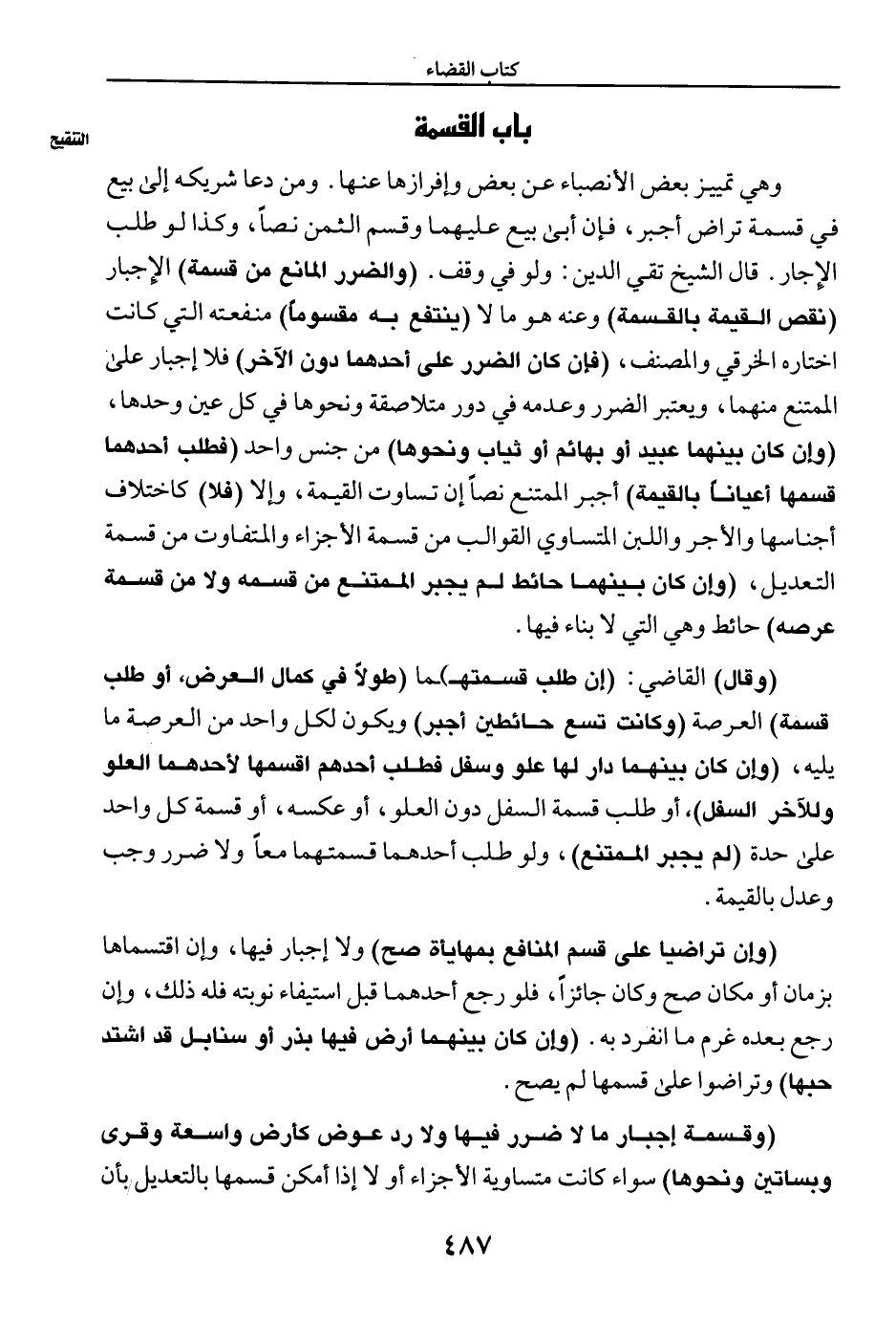 وهي تمييز بعض الأنصباء عن بعض وإفرازها عنها. ومن دعا شريكه إلى بيع في قسمة تراض أجبر، فإن أبى بيع عليهما وقسم الثمن نصًا، وكذا لو طلب الإجار. قال الشيخ تقي الدين: ولو في وقف. (والضرر المانع من قسمة) الإجبار (نقص القيمة بالقسمة) وعنه هو ما لا (ينتفع به مقسومًا) منفعته التي كانت اختاره الخرقي والمصنف، (فإن كان الضرر على أحدهما دون الآخر) فلا إجبار على الممتنع منهما، ويعتبر الضرر وعدمه في دور متلاصقة ونحوها في كل عين وحدها، (وإن كان بينهما عبيد أو بهائم أو ثياب ونحوها) من جنس واحد (فطلب أحدهما قسمها أعيانًا بالقيمة) أجبر الممتنع نصًا إن تساوت القيمة، وإلا (فلا) كاختلاف أجناسها والأجر واللبن المتساوي القوالب من قسمة الأجزاء والمتفاوت من قسمة التعديل، (وإن كان بينهما حائط لم يجبر الممتنع من قسمه ولا من قسمة عرصه) حائط وهي التي لا بناء فيها.