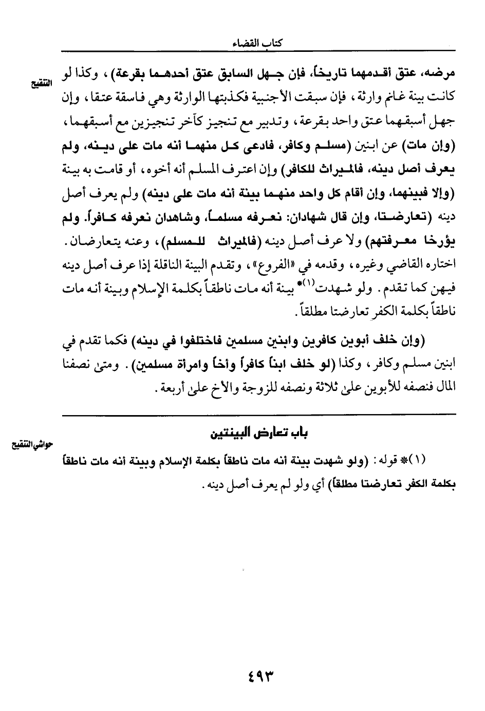 مرضه، عتق أقدمهما تاريخًا، فإن جهل السابق عتق أحدهما بقرعة)، وكذا لو كانت بينة غانم وارثة، فإن سبقت الأجنبية فكذبتها الوارثة وهي فاسقة عتقا، وإن جهل أسبقهما عتق واحد بقرعة، وتدبير مع تنجيز كآخر تنجيزين مع أسبقهما، (وإن مات) عن ابنين (مسلم وكافر، فادعى كل منهما أنه مات على دينه، ولم يعرف أصل دينه، فالميراث للكافر) وإن اعترف المسلم أنه أخوه، أو قامت به بينة (وإلا فبينهما، وإن أقام كل واحد منهما بينة أنه مات على دينه) ولم يعرف أصل دينه (تعارضتا، وإن قال شهادان: نعرفه مسلمًا، وشاهدان نعرفه كافرًا. ولم يؤرخا معرفتهم) ولا عرف أصل دينه (فالميراث للمسلم)، وعنه يتعارضان. اختاره القاضي وغيره، وقدمه في "الفروع"، وتقدم البينة الناقلة إذا عرف أصل دينه فيهن كما تقدم. ولو شهدت (١)، بينة أنه مات ناطقًا بكلمة الإسلام وبينة أنه مات ناطقًا بكلمة الكفر تعارضتا مطلقًا.