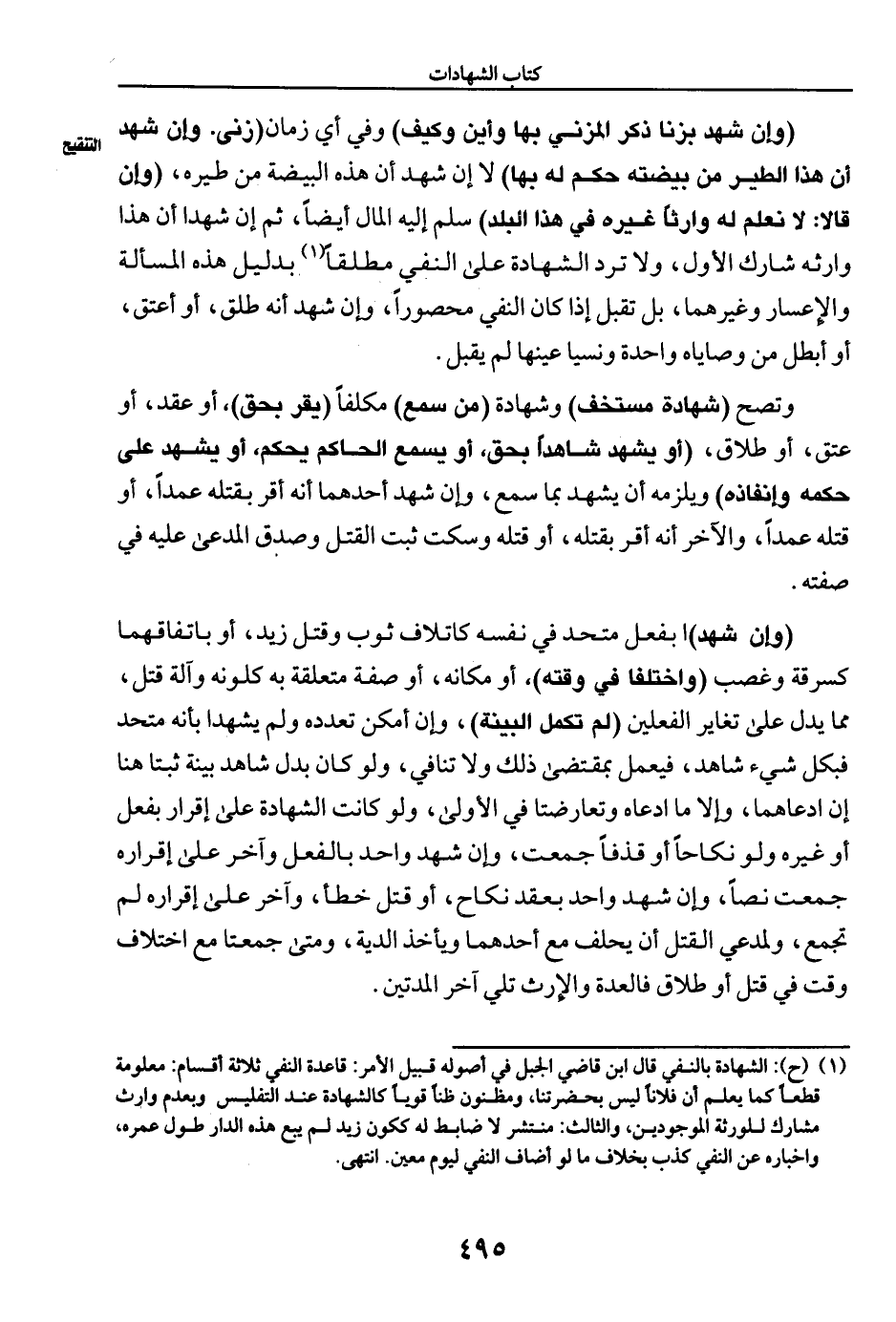 (¬١) (ح): الشهادة بالنفي قال ابن قاضي الجبل في أصوله قبيل الأمر: قاعدة النفي ثلاثة أقسام: معلومة قطعًا كما يعلم أن فلانًا ليس بحضرتنا، ومظنون ظنًا قويًا كالشهادة عند التفلبس وبعدم وارث مشارك للورثة الموجودين، والثالث: منتشر لا ضابط له ككون زيد لم بيع هذه الدار طول عمره، وإخباره عن النفي كذب بخلاف ما لو أضاف النفي ليوم معين. انتهى.