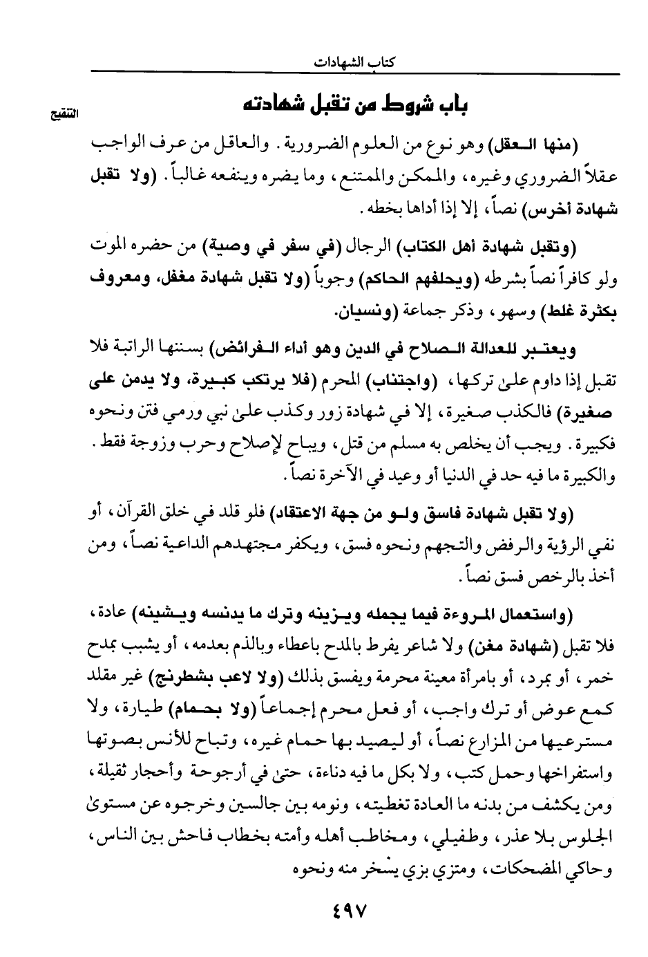 ويعتبر للعدالة الصلاح في الدين وهو أداء الفرائض) بسننها الراتبة فلا تقبل إذا داوم على تركها، (واجتناب) المحرم (فلا يرتكب كبيرة، ولا يدمن على صغيرة) فالكذب صغيرة، إلا في شهادة زور وكذب على نبي ورمي فتن ونحوه فكبيرة. ويجب أن يخلص به مسلم من قتل، ويباح لإصلاح وحرب وزوجة فقط. والكبيرة ما فيه حد في الدنيا أو وعيد في الآخرة نصًا.