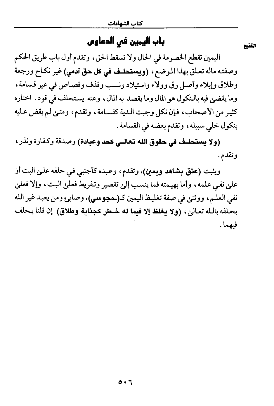 اليمين تقطع الخصومة في الحال ولا تسقط الحق، وتقدم أول باب طريق الحكم وصفته ماله تعلق بهذا الموضع، (ويستحلف في كل حق آدمي) غير نكاح ورجعة وطلاق وإيلاء وأصل رق وولاء واستيلاد ونسب وقذف وقصاص في غير قسامة، وما يقضى فيه بالنكول هو المال وما يقصد به المال، وعنه يستحلف في قود. اختاره كثير من الأصحاب، فإن نكل وجبت الدية كقسامة، وتقدم، ومتى لم يقض عليه بنكول خلي سبيله، وتقدم بعضه في القسامة.
