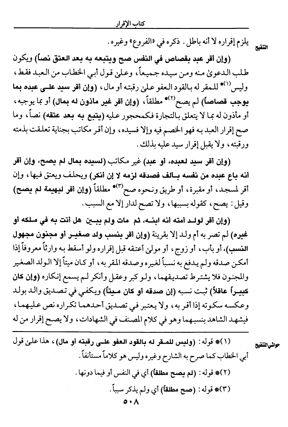 (وإن أقر عبد بقصاص في النفس صح ويتبعه به بعد العتق نصًا) ويكون طلب الدعوى منه ومن سيده جميعًا، وعلى قول أبي الخطاب من العبد فقط، وليس (¬١) * للمقر له بالقود العفو على رقبته أو مال، (وإن أقر سيد على عبده بما يوجب قصاصًا) لم يصح (¬٢) * مطلقًا، (وإن أقر غير مأذون له بمال) أو بما يوجبه، أو مأذون له بما لا يتعلق بالتجارة فكمحجور عليه (يتبع به بعد عتقه) نصًا، وما صح إقرار العبد به فهو الخصم فيه وإلا فسيده، وإن أقر مكاتب بجناية تعلقت بذمته ورقبته، ولا يقبل إقرار سيد عليه بذلك.