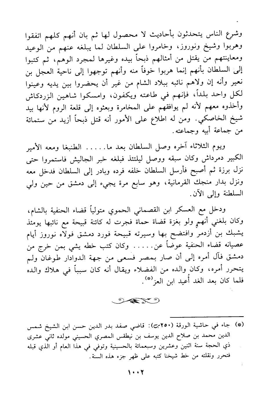 ودخل مع العسكر ابن القصماني الحموي متوليًا قضاء الحنفية بالشام، وكان بلغني أنهم ولو بغزة قضاة حماة فجرت له كائنة قبيحة مع نائبها يومئذ يشبك بن أزدمر وافتضح بها وسيرته قبيحة فورد دمشق فولاه نوروز أيام عصيانه قضاء الحنفية عوضًا عن ..... وكان كتب خطه يشي بمن خرج من دمشق فآل أمره إلى أن صار بمصر فسعى من جهة الدوادار طوغان ولم يتحرر أمره، وكان والده من الفضلاء ويقال أنه كان سببًا في هلاك والده فلما كان بعد الغد أُعيد ابن العز (*).