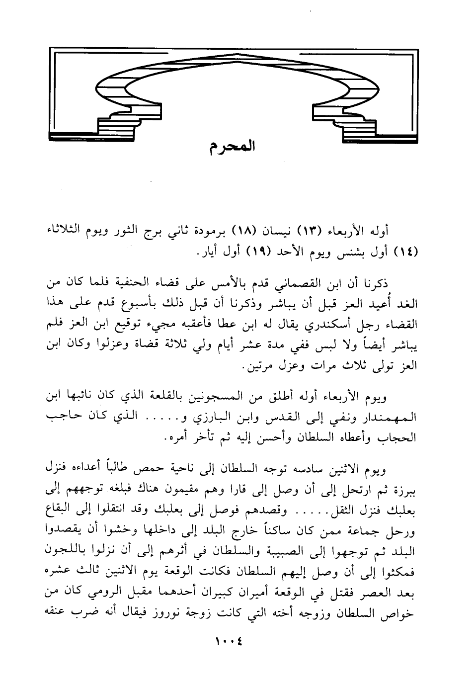 ويوم الأربعاء أوله أطلق من المسجونين بالقلعة الذي كان نائبها ابن المهمندار ونفي إلى القدس وابن البارزي و ..... الذي كان حاجب الحجاب وأعطاه السلطان وأحسن إليه ثم تأخر أمره.