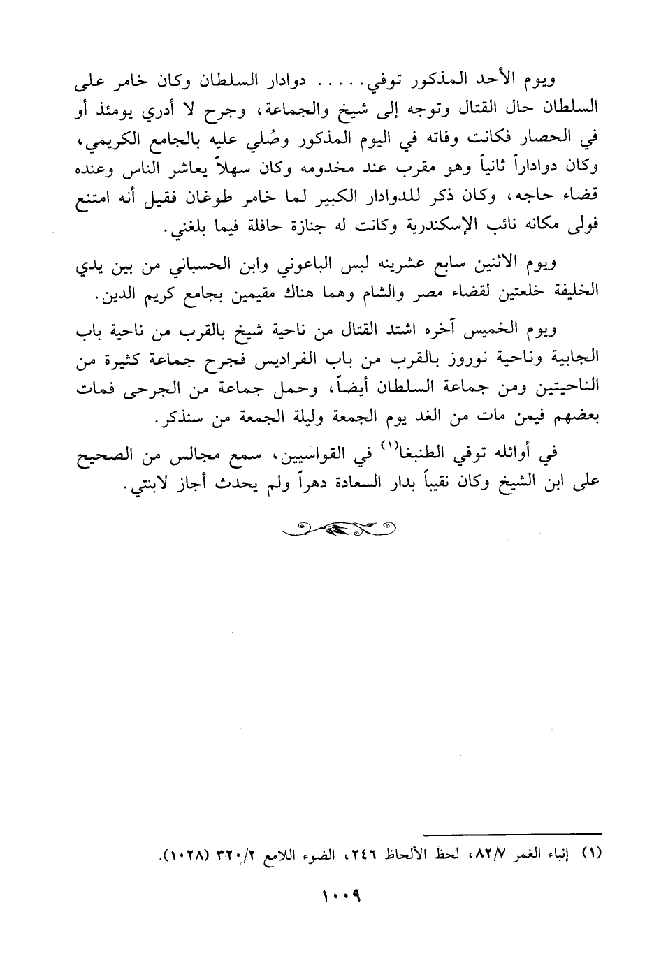 ويوم الأحد المذكور توفي ..... دوادار السلطان وكان خامر على السلطان حال القتال وتوجه إلى شيخ والجماعة، وجرح لا أدري يومئذ أو في الحصار فكانت وفاته في اليوم المذكور وصُلي عليه بالجامع الكريمي، وكان دوادارًا ثانيًا وهو مقرب عند مخدومه وكان سهلًا يعاشر الناس وعنده قضاء حاجه، وكان ذكر للدوادار الكبير لما خامر طوغان فقيل أنه امتنع فولى مكانه نائب الإسكندرية وكانت له جنازة حافلة فيما بلغني.