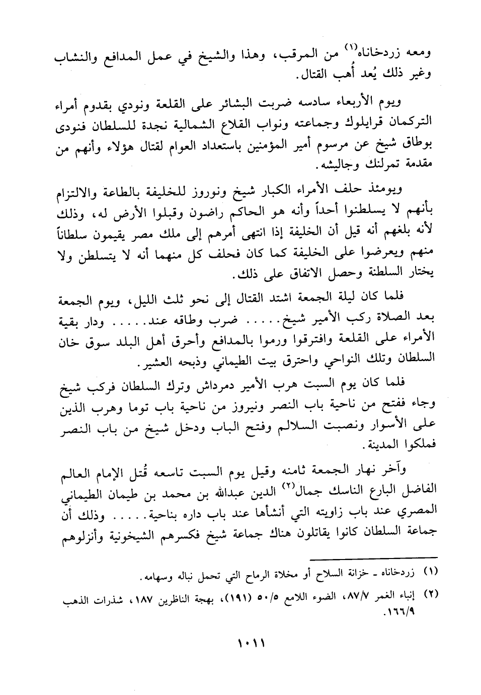 فلما كان ليلة الجمعة اشتد القتال إلى نحو ثلث الليل، ويوم الجمعة بعد الصلاة ركب الأمير شيخ ..... ضرب وطاقه عند ..... ودار بقية الأمراء على القلعة وافترقوا ورموا بالمدافع وأحرق أهل البلد سوق خان السلطان وتلك النواحي واحترق بيت الطيماني وذبحه العشير.