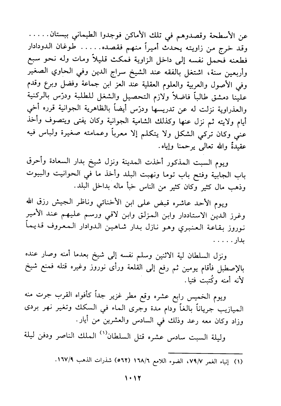 عن الأسطحة وقصدوهم في تلك الأماكن فوجدوا الطيماني ببستان ..... وقد خرج من زاويته يحدث أميرًا منهم فقصده ..... طوغان الدودادار فطعنه فحمل نفسه إلى داخل الزاوية فمكث قليلًا ومات وله نحو سبع وأربعين سنة، اشتغل بالفقه عند الشيخ سراج الدين وفي الحاوي الصغير وفي الأصول والعربية والعلوم العقلية عند العز ابن جماعة وفضل وبرع وقدم علينا دمشق طالبًا فاضلًا ولازم التحصيل والشغل للطلبة ودرّس بالركنية والعذراوية نزلت له عن تدريسها ودرّس أيضًا بالظاهرية الجوانية قرره أخي أيام ولايته ثم نزل عنها وكذلك الشامية الجوانية وكان يفتى ويتصوف وأخذ عني وكان تركي الشكل ولا يتكلم إلا معربًا وعمامته صغيرة ولباس فيه عقيدة والله تعالى يرحمنا وإياه.