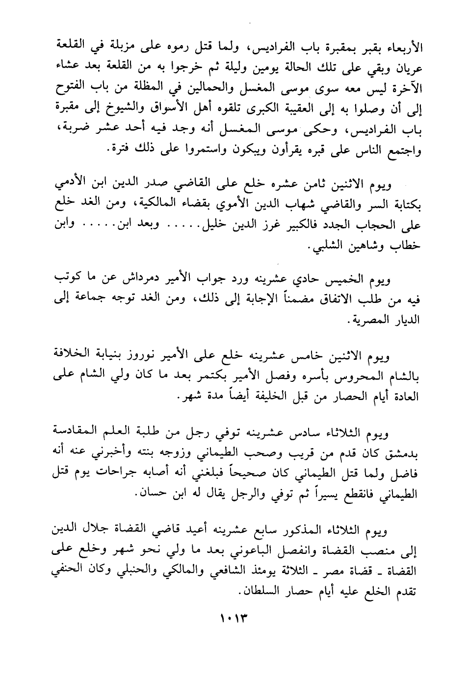 ويوم الاثنين ثامن عشره خلع على القاضي صدر الدين ابن الأدمي بكتابة السر والقاضي شهاب الدين الأموي بقضاء المالكية، ومن الغد خلع على الحجاب الجدد فالكبير غرز الدين خليل ..... وبعد ابن ..... وابن خطاب وشاهين الشلبي.